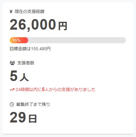 現在の調達率は16%、パトロン様は5名となっております。