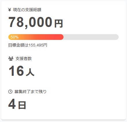 現在の調達率は50%、パトロン様は16名となっております。