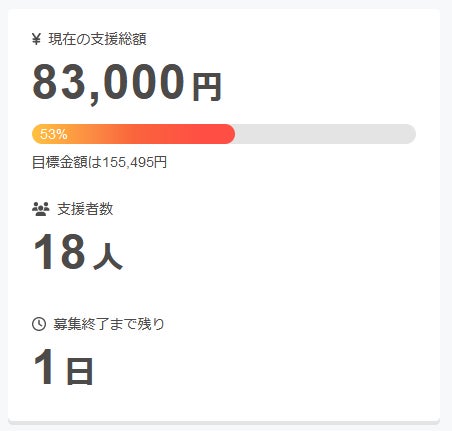 現在の調達率は53%、パトロン様は18名となっております。