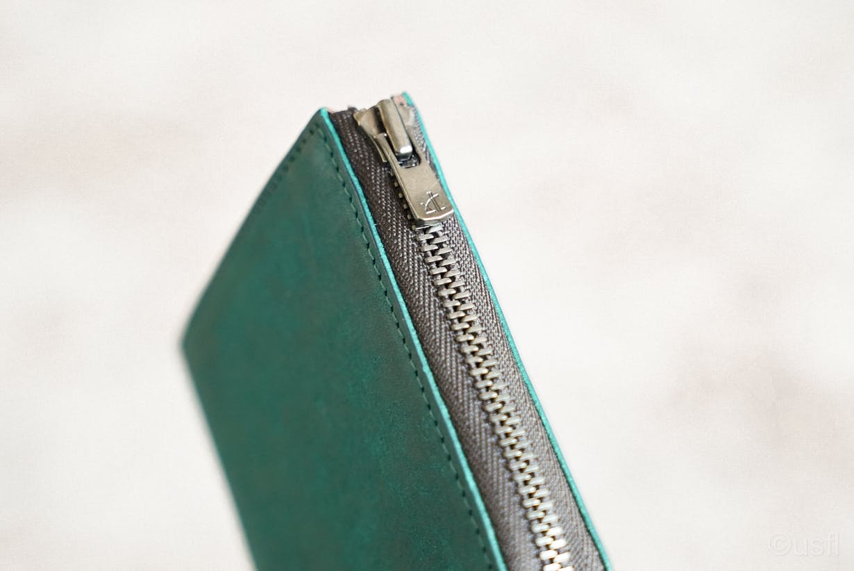 ホックで閉じる財布は「ホックで支えていない部分」が膨らみます。ファスナーでしっかり閉じることで、手で押さえつけなくても薄さをキープできます。また、カバンの中でこぼれることもありません。