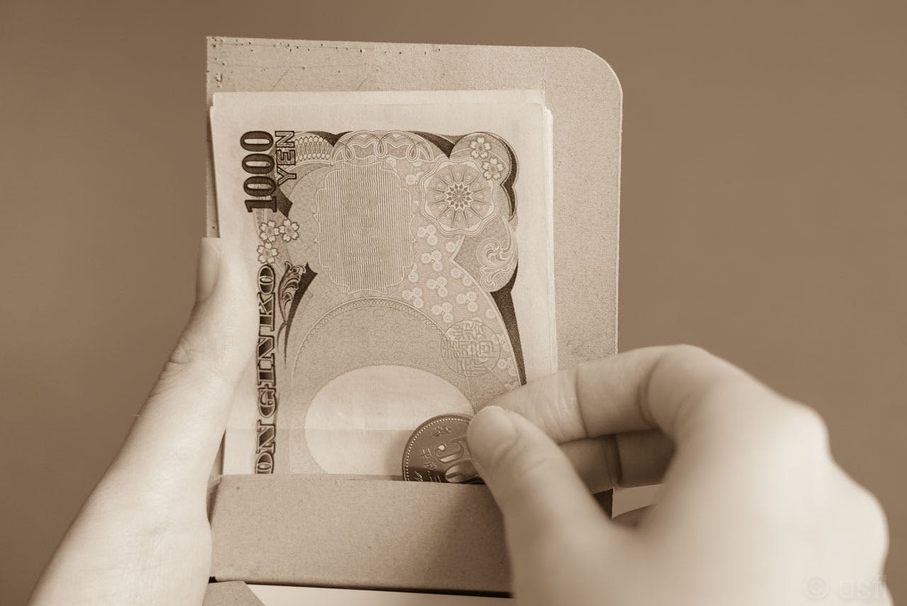 薄い革で作れば、財布は薄くなります。しかし、財布がやわらかくなり、お金を入れると膨らんでしまいます。指でギュッと押さえて、薄く見せることはできますが、それでは薄い財布とは言えません。