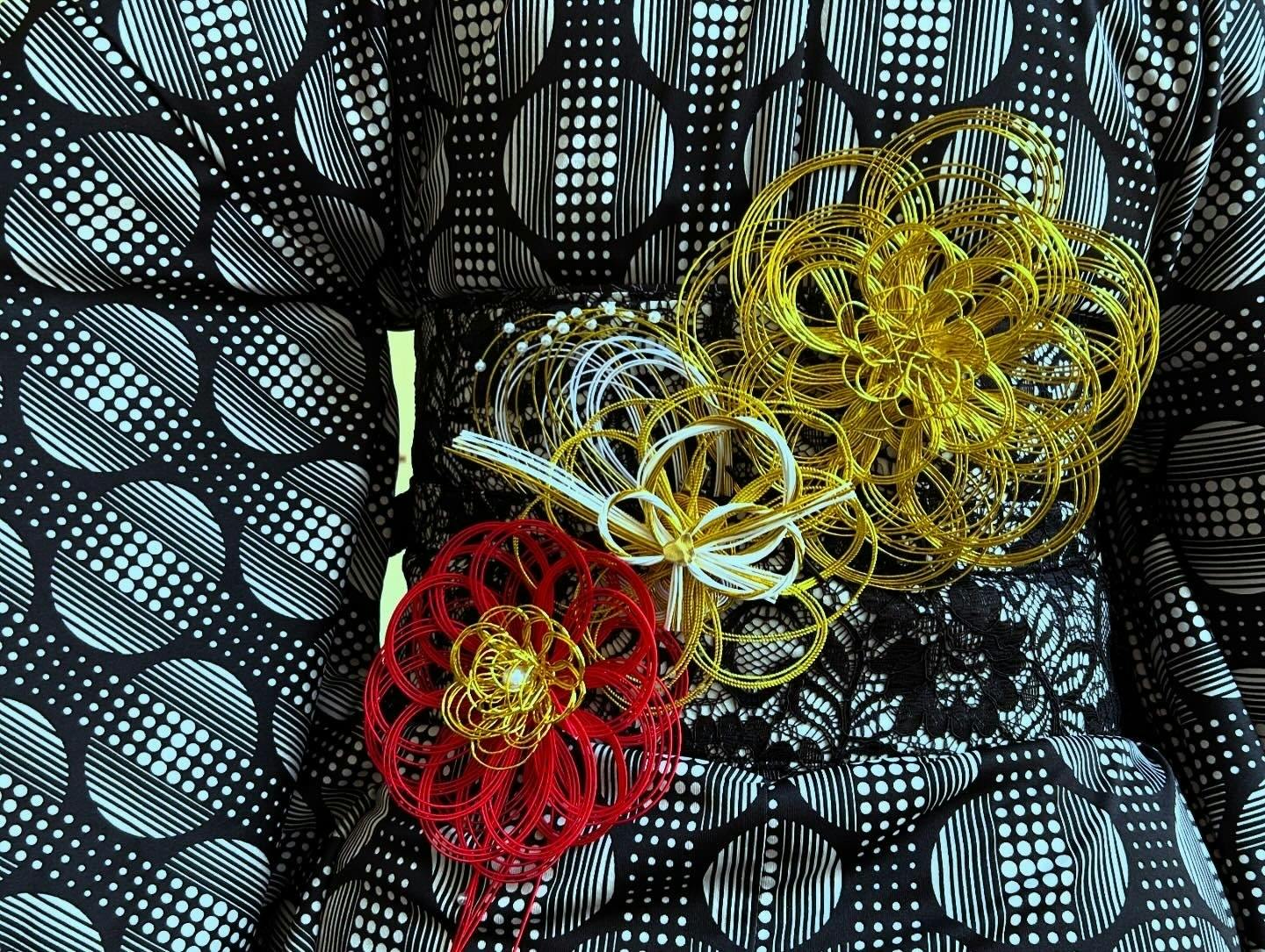 お着物がシックなので、おめでたい赤と金をメインに。海外の方からは、これは何?何でできてるのか?の質問に、必死にGoogle翻訳で説明していたわたしです笑