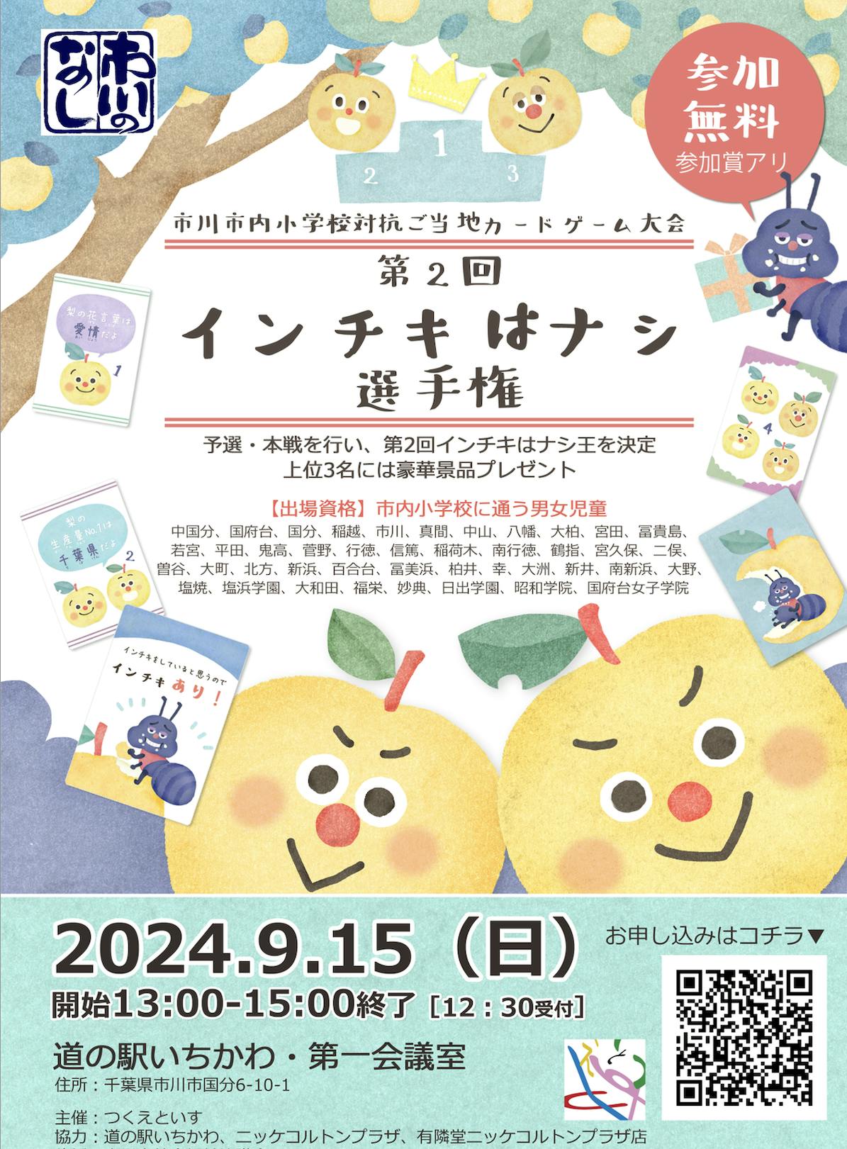 経緯:市川市発のご当地カードゲーム制作プロジェクト第一弾として、千葉県市川市といえば梨の名産地ということもあり、JAいちかわさん協力の基、地域ブランド「市川の梨」商標入りカードゲーム「インチキはナシ」を昨年の梨シーズンに開発いたしました。