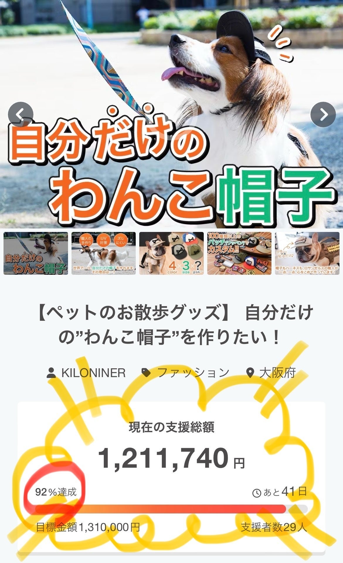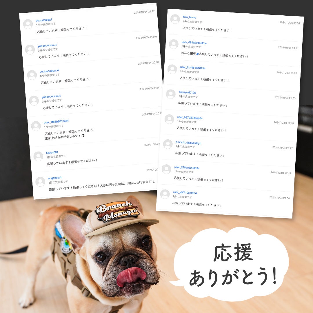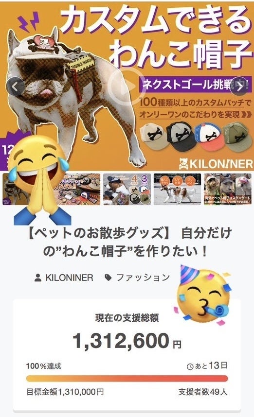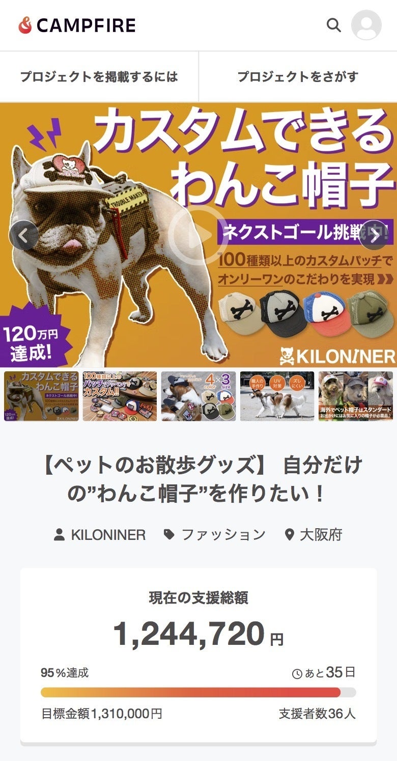95%までたどり着くことができました!ご支援、応援いただいている皆様、本当にありがとうございます。\あと5%!あと35日/さらに多くの方へ「わんこ帽子」について知っていただくため、紹介ページをパワーアップしました。①動画でもっとイメージしやすく!②そもそも、パッチカスタムって?③帽子はお散歩の必需品?是非、閲覧&拡散をよろしくお願いいたします。\メインビジュアルも目新しく/前回、モデルをしてくれた子(画像上)の犬種はご存知でしょうか?正解は「コイケルフォンディエ」有名な日本人メジャーリーガーのワンちゃんと同じ!と言った方が伝わるとは飼い主さん談です^^;改めてご協力ありがとうございます。今回は実店舗「KILONINER Dept.」の看板犬、フレンチブルドッグの源ちゃんです。(画像下)10/31に4歳のお誕生日を迎えます!メインビジュアルも超カッコいいので、見てみてくださいね。引き続き、あたたかなご声援をよろしくお願いいたします!