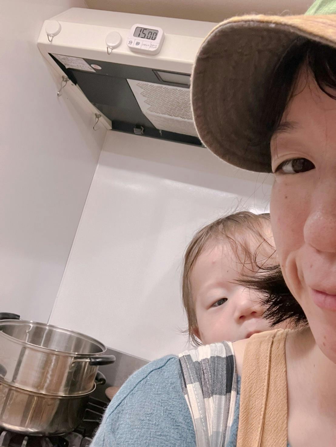 背中から見えるお料理ができていく景色をいつも見ているあおばは、なんでも食べる食いしん坊に育っています!
