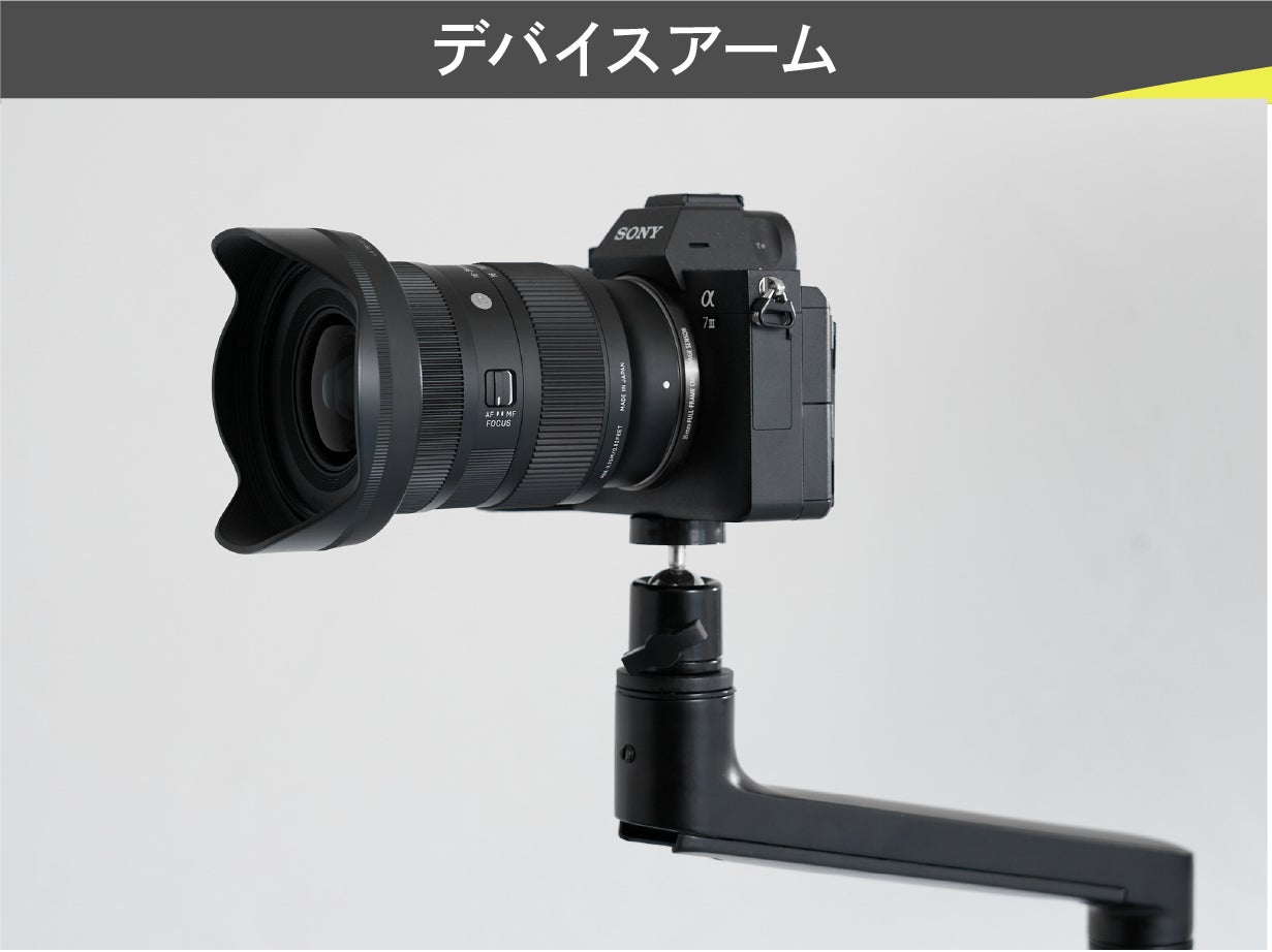カメラやスマートフォンをセットできるデバイスマウントは、360°ボールヘッドを採用。(1/4インチネジ)