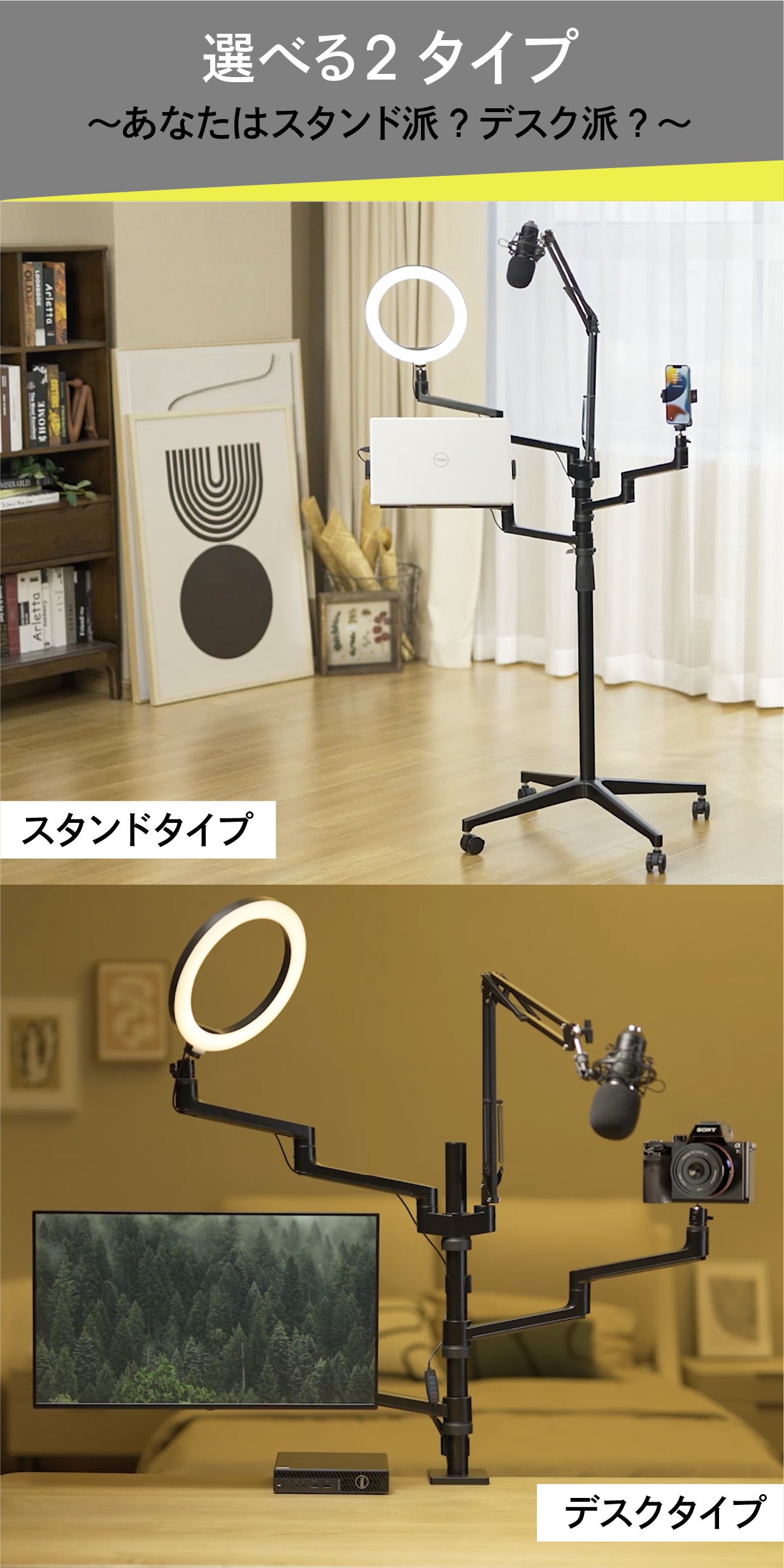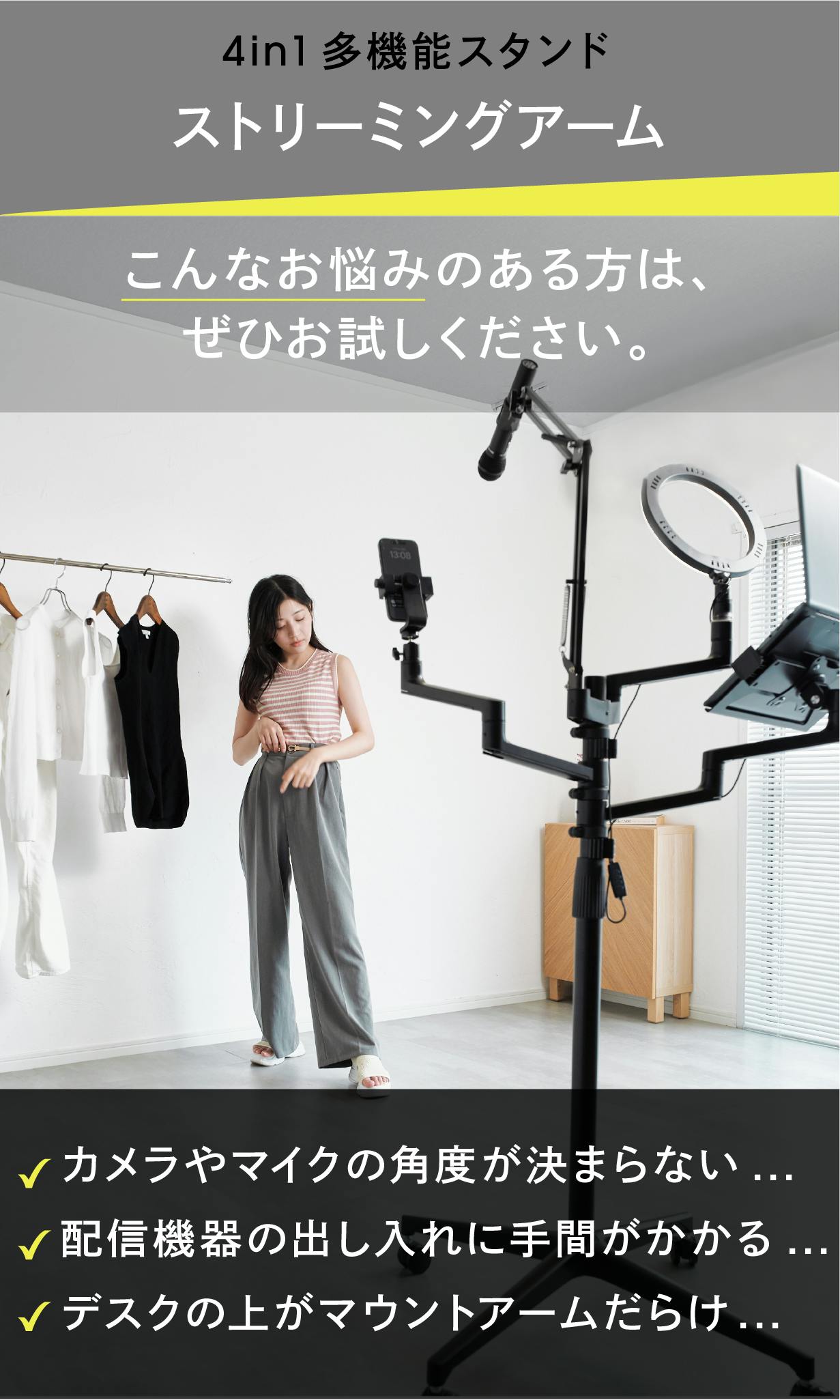 「ストリーミングアーム」では、キャスターのついた「スタンドタイプ」と、デスクに固定して使用する「デスクタイプ」の2種類をご容姿。