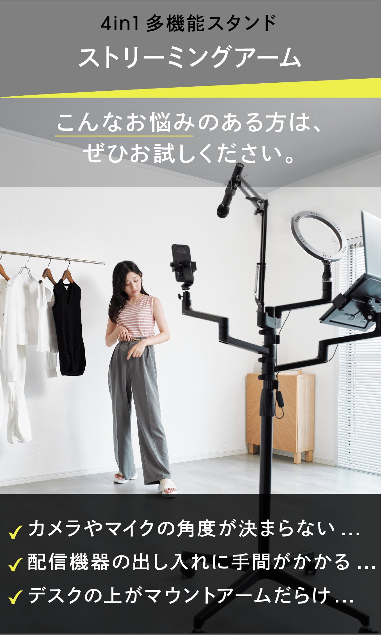 料理やファッション紹介などご自身が立ったまま配信するジャンルや、エクササイズなど広い場所で配信するジャンルに適したスタンドタイプ。