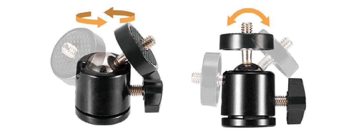 カメラやスマートフォンをセットできるデバイスマウントは、360°ボールヘッドを採用。(1/4インチネジ)