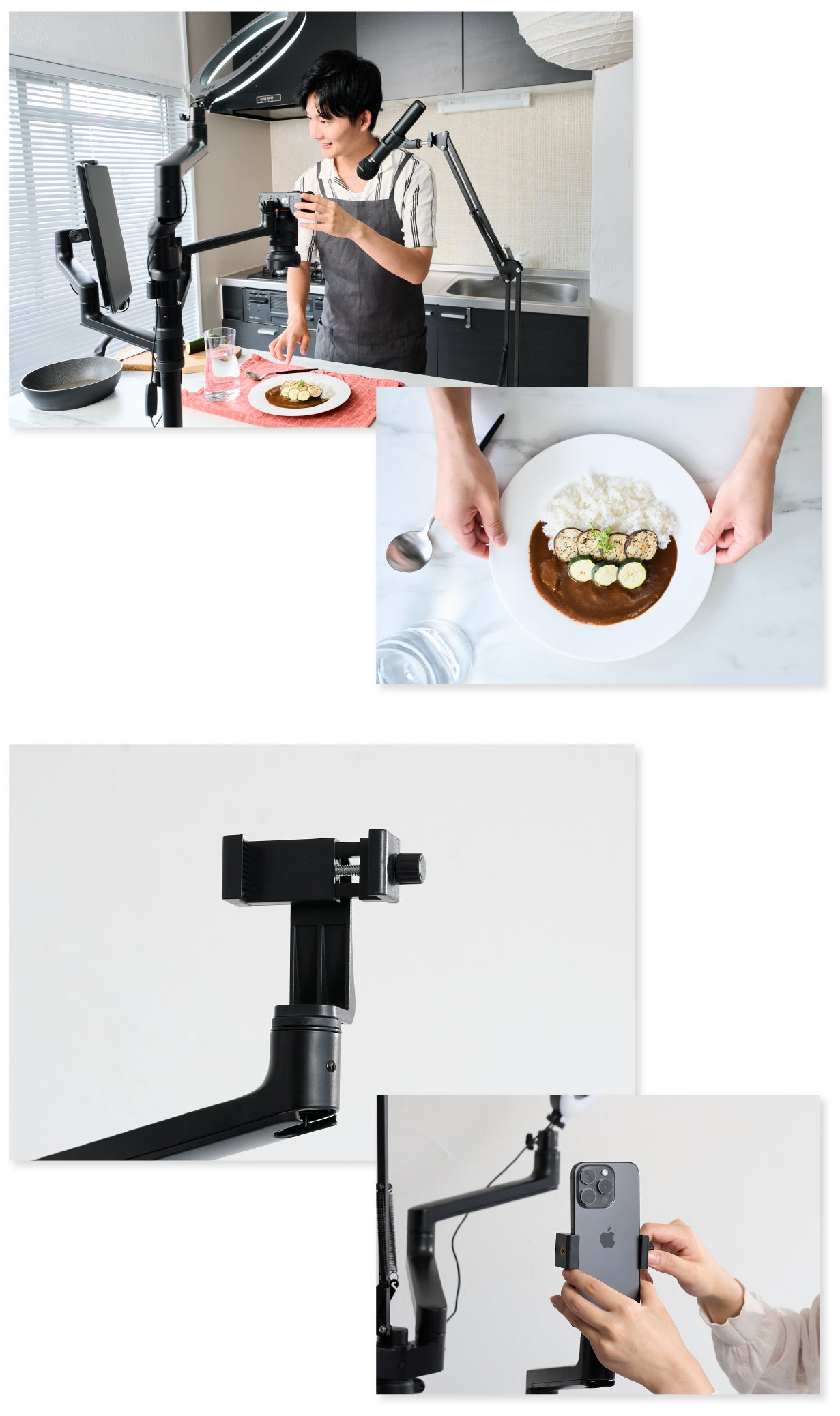 幅55-105mmのスマートフォンをセット可能。縦長動画の撮影も手軽に行えます。