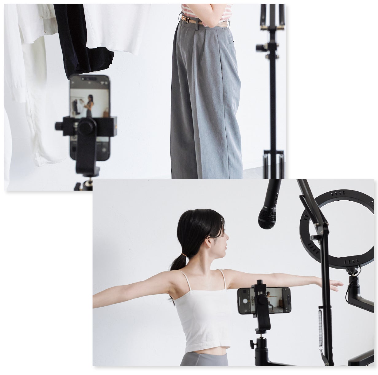 料理やファッション紹介などご自身が立ったまま配信するジャンルや、エクササイズなど広い場所で配信するジャンルに適したスタンドタイプ。