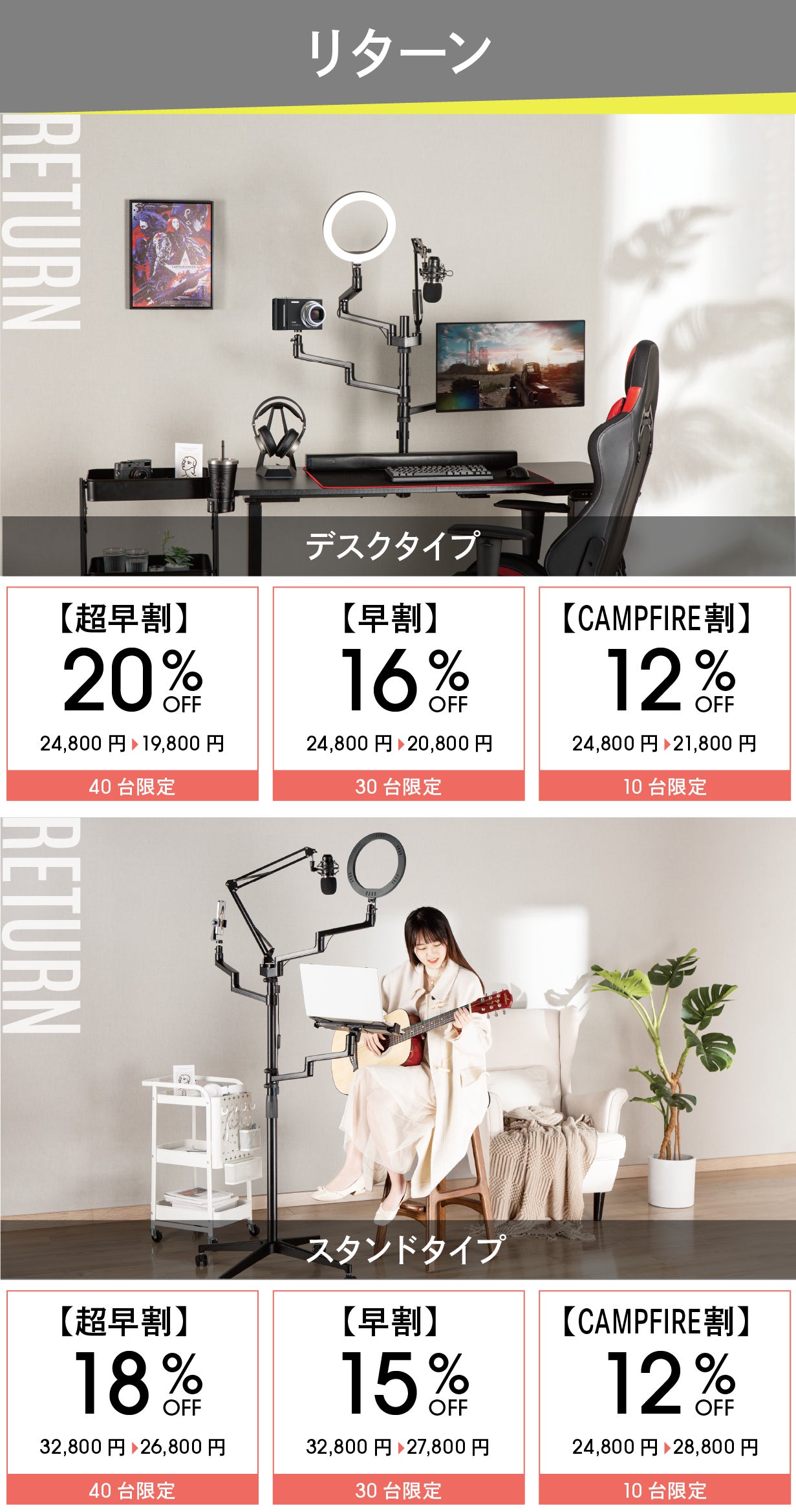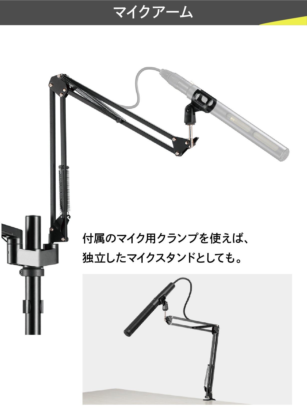 「ストリーミングアーム」では、キャスターのついた「スタンドタイプ」と、デスクに固定して使用する「デスクタイプ」の2種類をご容姿。