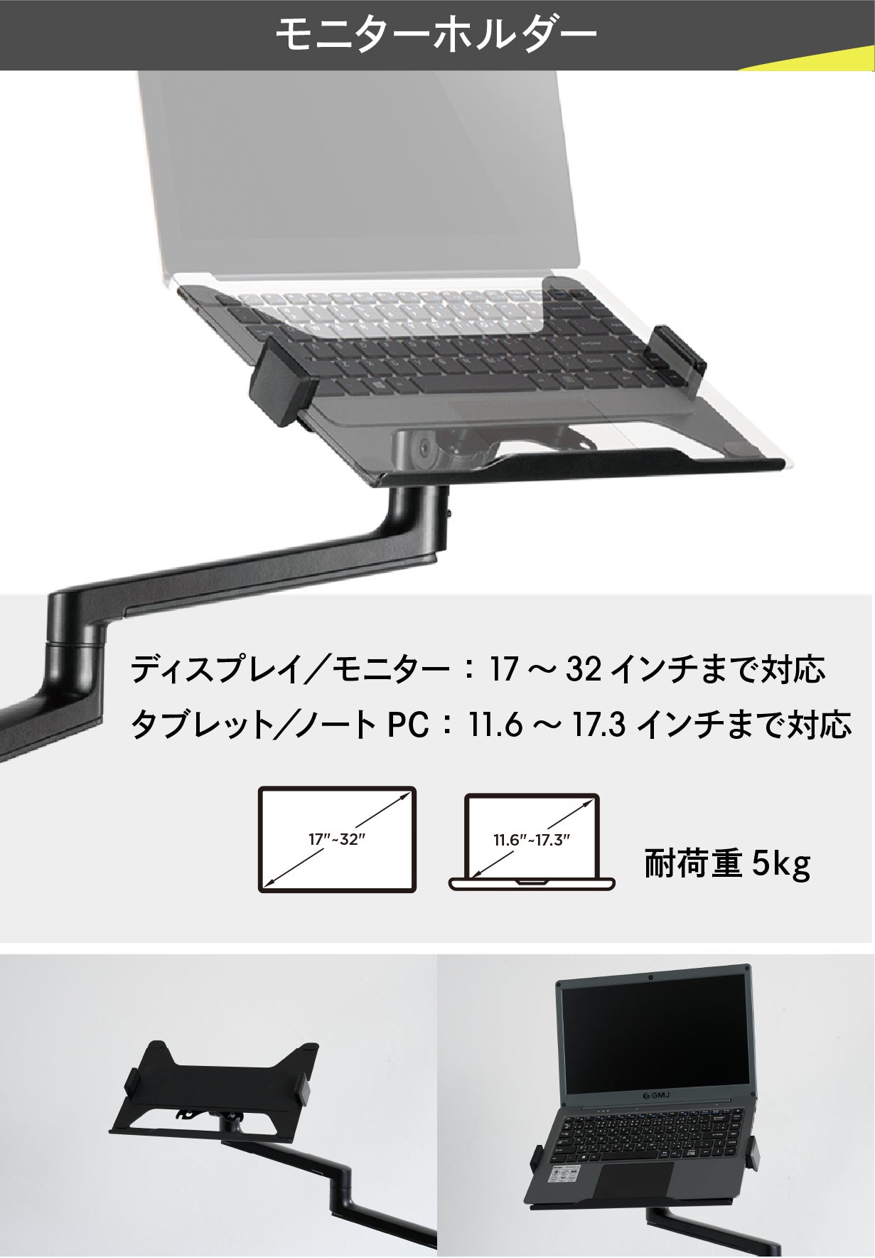 ノートPCやタブレットをセットする場合には、モニターホルダーに専用の「タブレットホルダー」をMネジで固定し、サイドバーでサイズを調整してください。
