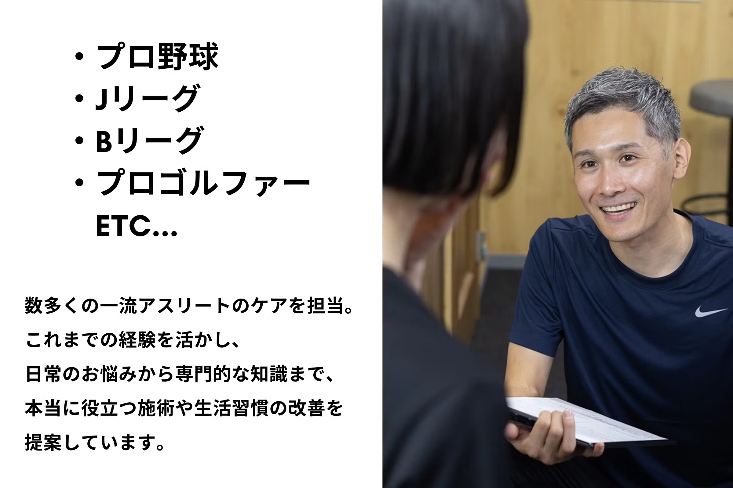 ・プロ野球、Jリーグ、Bリーグ、プロゴルファー、etc...多くの一流アスリートのケアを担当。
