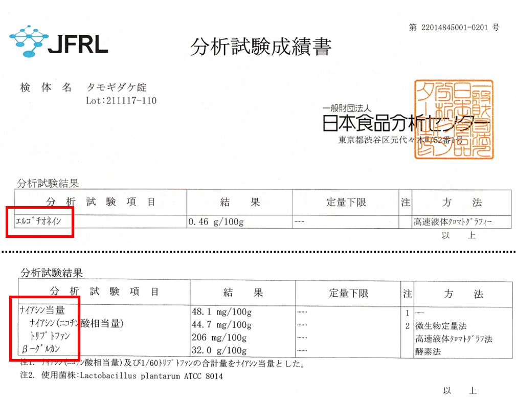 下記の画像はたもぎ茸のサプリメント(サンプル)を製造した際に日本食品分析センターという分析機関へリサーチをお願いした結果の、一部抜粋したものを掲載させて頂きました。