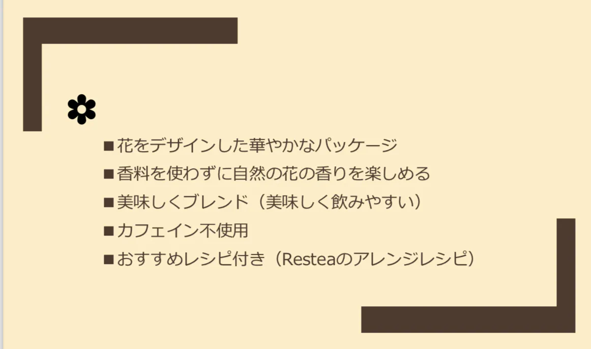 私たちが開発したオリジナルハーブティー「毎日頑張るあなたへ★幸せ感じるRestea」は,ストレス緩和に働きかけWell-beingを向上させる力を持つお花たちをたっぷり使ったハーブティーです。