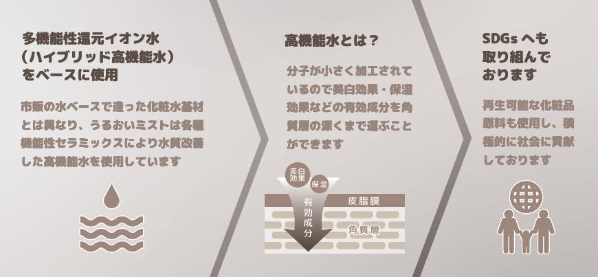 「LINO.URUOI MIST」には、微細化された水分子が角質層に届くよう工夫された多機能性還元イオン水を使用しています。