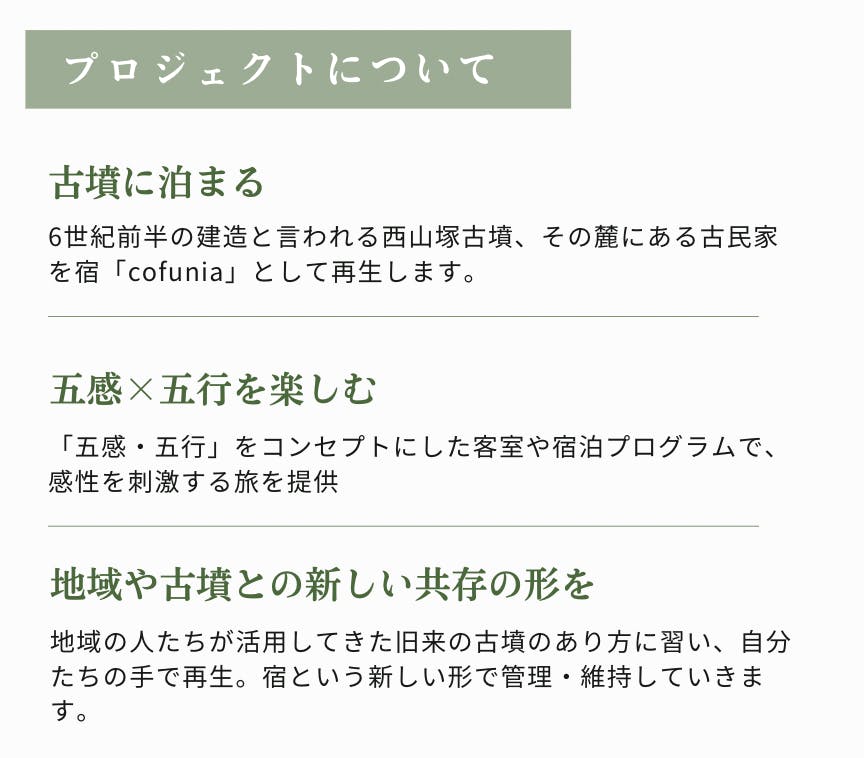 これらのリターンを通じて、古墳の麓での新しい宿泊体験「cofunia」の世界を、ご自宅でも楽しんでいただければと思います。ぜひ、この機会にcofuniaの世界に触れてみてください。