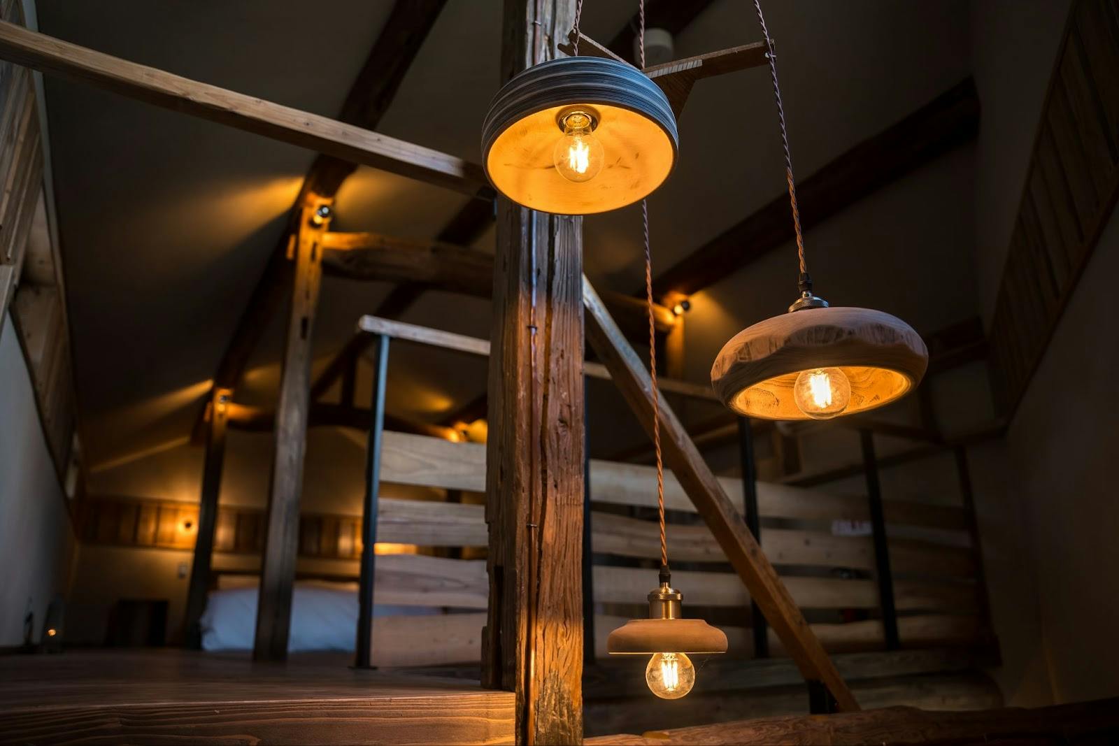 複数人で楽しめる、古材をふんだんに用いた山小屋のような空間が特徴の「き(木の棟)」。小上がりの階段を上がると、二階には最大4名での利用が可能な寝室があります。