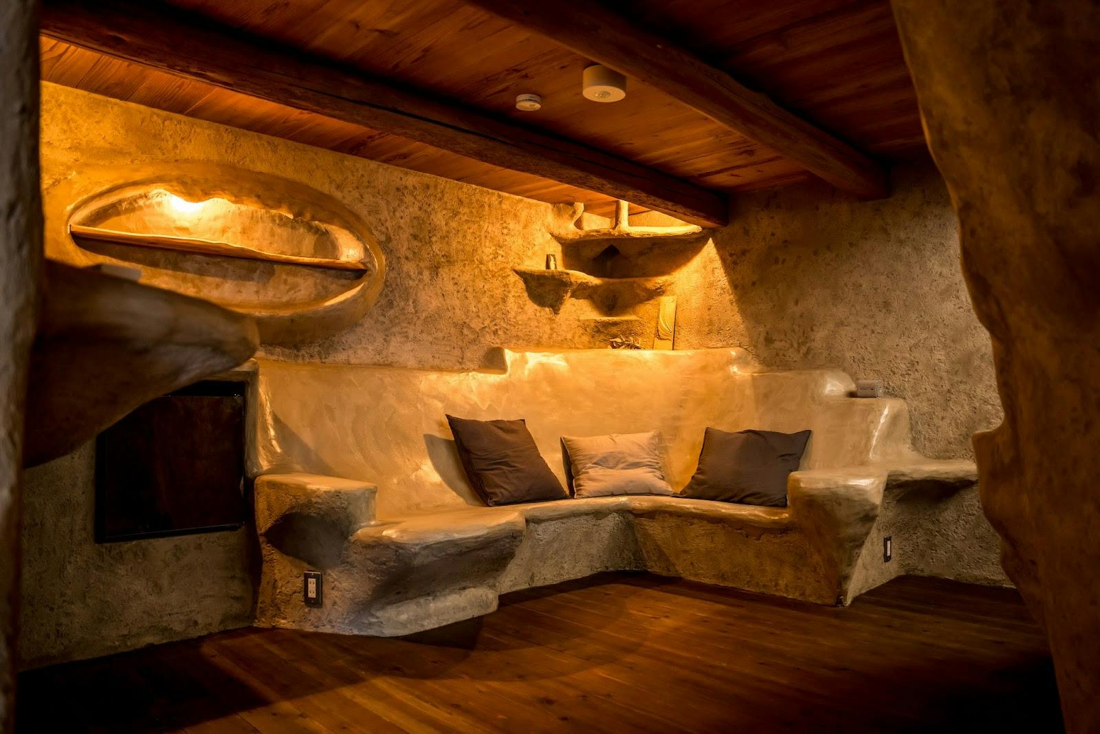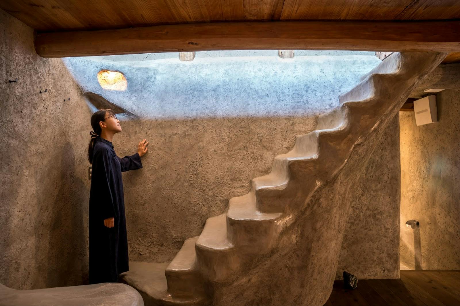 洞窟のような室内を抜けると、階段の向こうに地上の光が差し込む「つち(土の棟)」。寝室は二階にあり、墳丘の眺めが広がります。