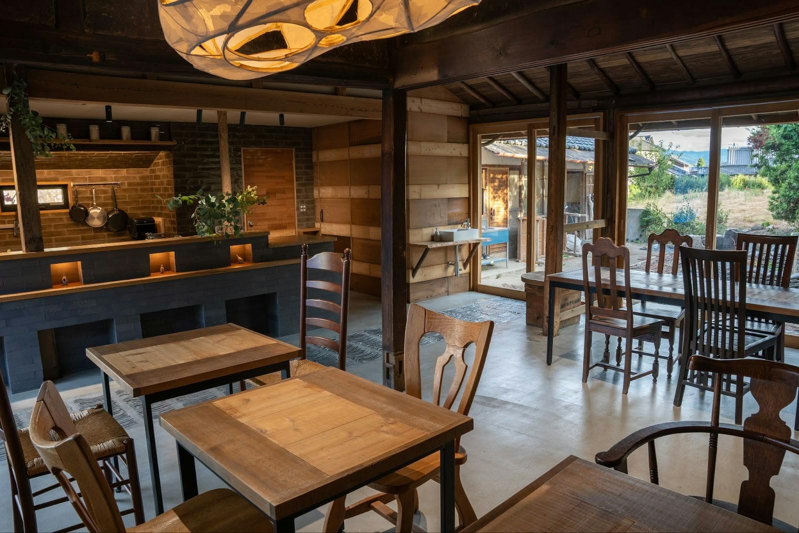 「ひ(火の棟)」は一番大きな建物で、この宿のフロントであり、飲食棟でもあります。以前使われていたかまど(おくどさん)の形をキッチンに取り入れたつくりとなっています。
