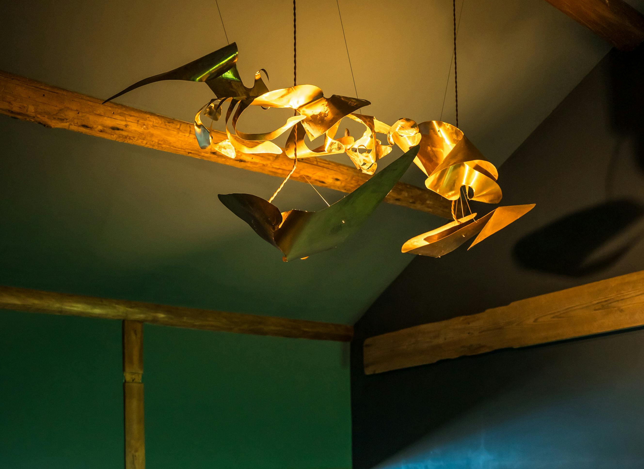青い壁にきらめく、真鍮製のオリジナル作品が心を魅了してくれる平家棟の「こがね(金の棟)」。