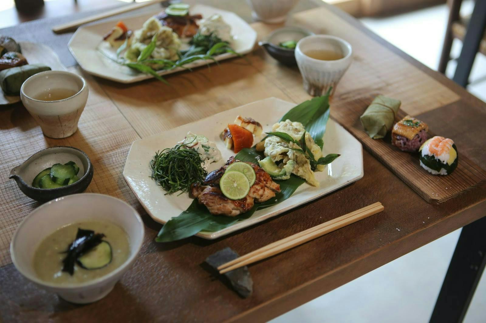 大和野菜や、柿の葉寿司などを盛り込んだ食事で奈良の味を楽しむ