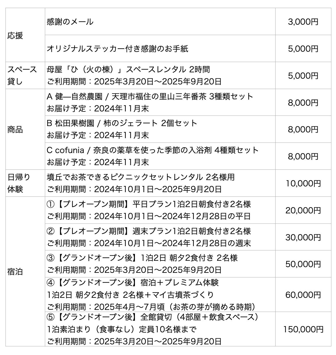 cofuniaを応援してくださる方への感謝の気持ちを込めて、特別価格にて早期予約を提供させていただきます。また、現地での体験が難しい方々のために、奈良の特産品のリターンもご用意しています。
