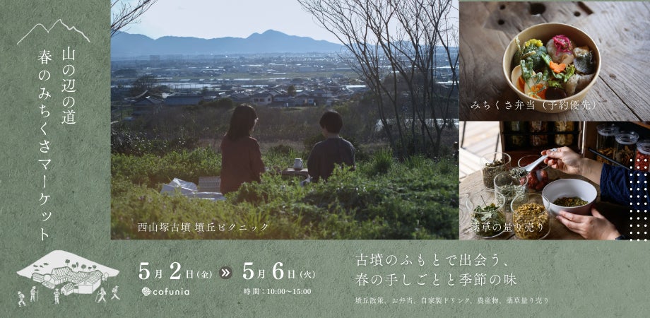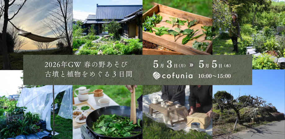 2026/03/24 08:00支援してくださった皆さまへいつもcofuniaを支えてくださり、ありがとうございます。2025年春分の日に西山塚古墳のふもとに宿がオープンして、一年が経ちました。土を触り、場を整え、少しずつ人が訪れはじめたこの一年。気づけば、季節はまた巡り、春を迎えています。この春、その時間を少しだけひらく三日間を設けることにしました。2026年5月3日〜5日「春の野あそび|古墳と植物をめぐる3日間」古墳を歩き、野草にふれ、茶を摘む。墳丘でピクニックをしたり、風のなかでお茶を飲んだり。この土地に流れてきた時間に、そっと触れる三日間です。もしタイミングが合えば、この機会にぜひ足を運んでいただけたら嬉しいです。━━━━━━━━━━━━━━━━━━━━ ■ 開催概要━━━━━━━━━━━━━━━━━━━━日程:2026年5月3日(日)〜5月5日(火・祝)時間:10:00〜15:00会場:cofunia(奈良県天理市萱生町1021|西山塚古墳のふもと)【 プログラム 】参加費 各4,000円 / 午前・午後通し参加 7,000円(当日現地でお支払いください。)◎ となりのモブ古墳さんぽ5月3日(日)10:00〜12:00 / 5月5日(火・祝)13:00〜15:00cofuniaは大和(おおやまと)古墳群の大小数多くの古墳に囲まれています。その中の比較的マイナーで小さな古墳を中心とした12基を、ゆる〜く巡るお散歩ツアーです。教科書的な歴史解説はなし。のどかな農村風景を楽しみながら、地域に密着した様々な古墳の姿を楽しみましょう。いくつかの野菜果物の無人販売所もコース上にあります。所要時間は2時間程度(約3.5km)。散策後はcofuniaにてドリンクを1杯、プレゼントさせていただきます。コース:cofunia→空路宮山(くろくやま)古墳→波多子塚古墳→クラ塚古墳→ヒエ塚古墳→ノムギ古墳→マバカ古墳→栗塚古墳→西ノ塚古墳→下池山古墳→ホックリ塚古墳→火矢塚(ひやづか)古墳→燈籠山(とうろうやま)古墳→cofunia所要時間:2時間程度(距離:約3.5km)参加費:4,000円(ワンドリンク付き)定 員:各回8名服装:履き慣れた歩きやすい履き物持ち物:水分補給のためのドリンク類。無人販売でお買い物をする場合の買ったものを入れる袋、小銭。案内人:高野琢巳(奈良の古墳と地酒が大好きcofunia共同代表)───────────────────────◎ 墳丘に自生する野生茶づくり5月3日(日) 13:00〜14:30 / 5月4日(月・祝) 13:00〜14:30 八十八夜を過ぎた絶好の季節。西山塚古墳の墳丘に力強く育つ茶の木から、手作業で新芽を摘み取ります。 その場で手揉みし、香りが立ち上がる瞬間を分かち合う、一年に一度の手仕事です。プログラム・野生茶の茶摘み・製茶体験・お茶会(スイーツ付き)参加費:4,000円(手揉み茶の持ち帰り・試飲付き)定 員:各回6名案内人:前田知里(民族植物研究家)───────────────────────◎ 初夏の野草さんぽ5月4日(月・祝)10:00〜11:30 / 5月5日(火・祝)10:00〜11:30山の辺の道は、やわらかな若草色に包まれ、季節は初夏へと移りはじめています。足元に目を向けると、ハコベ、ヨモギ、タンポポ、ヤエムグラ…。小さな野草たちが、今の季節をそっと教えてくれます。一緒に歩き、見つけて、触れて、香って、ほんの少しだけお料理をして味わいましょう。五感で楽しむ、野草の時間。ご一緒にいかがですか。メニュー例(内容は季節や採取状況により変わることがあります)・胡麻和え・天ぷら・ペペロンチーノ風焼きそば・ハーブポテト・和と洋の薬草茶・野草のカップケーキ参加費:4,000円定 員:各回5名案内人:結城博美(ガーデンデザイナー、パーマカルチャーデザイナー、鍼灸師)───────────────────────【 3日間いつでも楽しめる体験 】◎ 墳丘ピクニック料金 ¥6,000/2名内容 墳丘貸切・大和茶・季節のお菓子三種セット時間 10:00~12:00 / 13:00~14:00 *予約推奨。あいていれば当日も受付可能です。◎ ハンモック料金 ¥1,000/1セット時間 1時間|返却時精算 *予約推奨。あいていれば当日も受付可能です。◎ 屋外茶室利用 「風の茶室」Open-Air Tea Pavillion料金 ¥2,000/人内容 蚊帳の茶室で薬草茶とスイーツを味わっていただけます。時間 1時間 *予約推奨。あいていれば当日も受付可能です。◎ カフェ・物販(予約不要)飲食 cofunia特製カレー・埴輪と土偶の月餅 コーヒー・薬膳茶・自家製果実シロップ ビール・ノンアルコールビール物販 やまのべ古墳マップ手ぬぐい バスソルト・薬膳茶・薬草量り売り───────────────────────訪れる人の時間が深くなるような場所として、育てていきたいと思います。引き続き、見守っていただけましたら幸いです。イベントの詳細・ご予約はこちらまでhttps://peatix.com/event/4939670/view━━━━━━━━━━━━━━━━━━━━━━━━━cofunia住所: 奈良県天理市萱生町1021電話番号:0743-20-6393メールアドレス:reservation@cofunia.co.jpホームページ:https://cofunia.co.jp/━━━━━━━━━━━━━━━━━━━━━━━━━ もっと見る