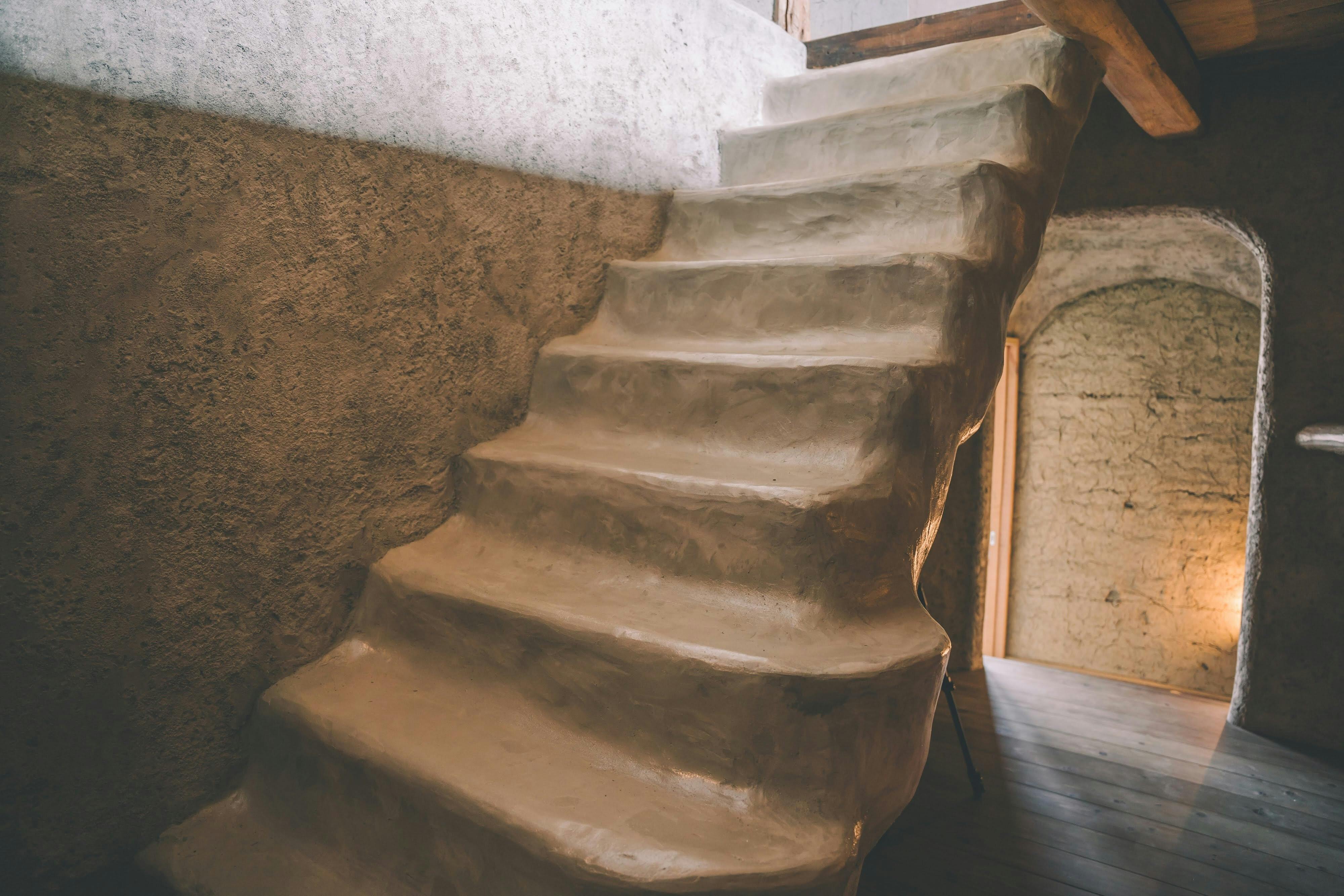 洞窟のような室内を抜けると、階段の向こうに地上の光が差し込む寝室が特徴的。寝室は二階にあり、墳丘の眺めが広がります。