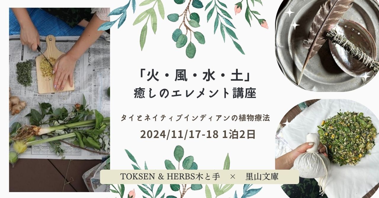 タイとアメリカのネイティブインディアンの植物療法に共通する「火・風・水・土」4つのエレメントを暮らしに取り入れ、心身のバランスを整える2日間の合宿です。