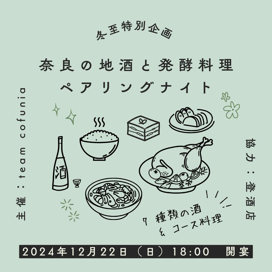冬至の夜、奈良の地酒と発酵料理が織りなす特別なひとときを過ごしませんか。奈良の地酒専門店「登酒店」の解説と、古墳の麓の宿料理人チーム「Team cofunia」によるコース仕立ての特別メニューをお楽しみいただけます。7種類の厳選された地酒と、それぞれに合わせた料理のペアリングが楽しめます。