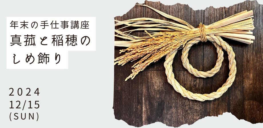 精麻商品・縁起物・手仕事を伝えるお店、農と暮らしと癒し「鯛安吉祥」の兼元奈美さんをお招きし、古代から受け継がれてきた「真菰」と「稲穂」を使った、しめ飾り作りを体験するワークショップを開催します。自然素材の温もりを感じながら、自分だけの特別なしめ飾りを一緒に作りましょう。
