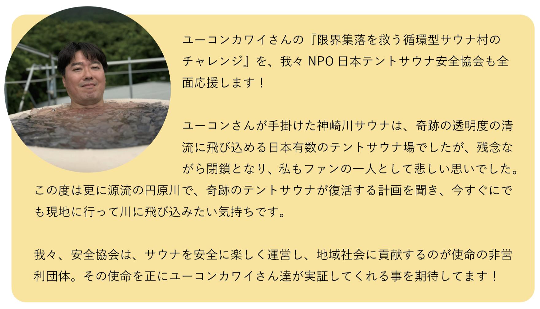 その奇跡のような場所に巡り会えたことで、今ではあの挫折にすら感謝をしています。そして、気持ちも新たに、「この神秘の川に失礼のない最高の場所を作っていこう!」「救ってくれた地域に恩返しをしていこう!!」「サウナーの課題と地域の課題を解決する、素敵な村を作っていこう!!!」と決意を新たにしたのです。