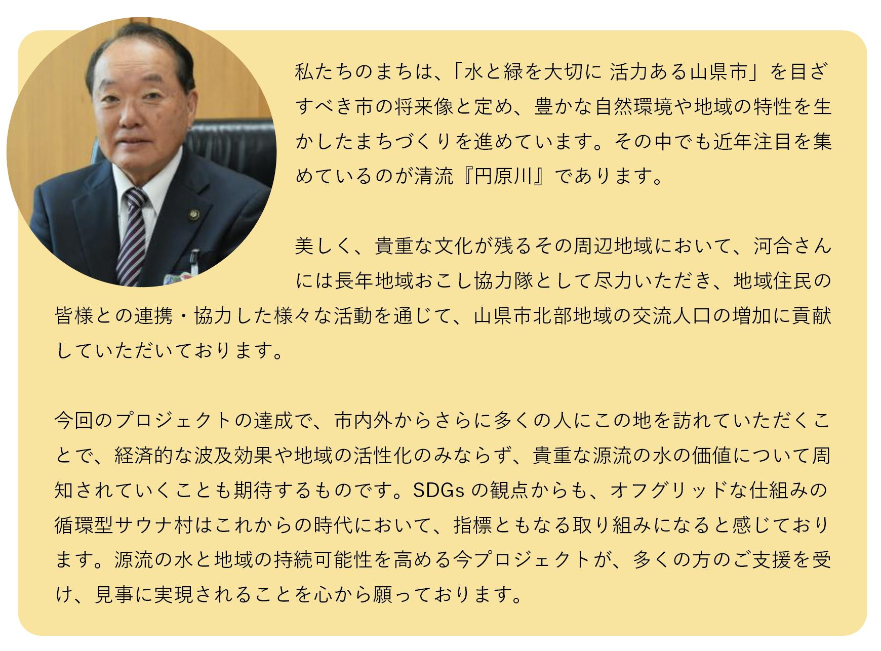 このサウナ村は、円原川の美しさとその水の価値を広めるための入口です。訪れた方々は、サウナを楽しむことで、知らず知らず地域の課題解決や自然保全活動に貢献します。村人(関係人口)となってオフグリッドな村づくりに携わった方々は「豊かに生きるためのヒント」を得ることができるでしょう。