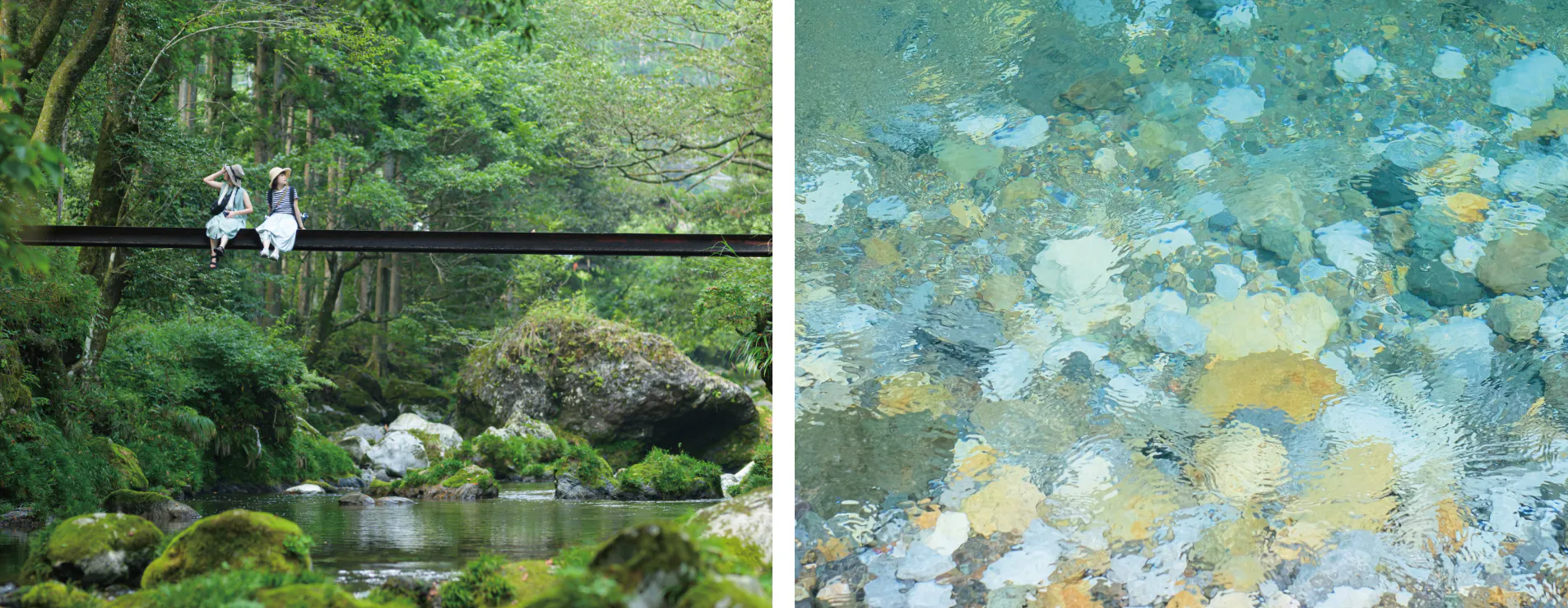 左)円原川の光芒。多くの写真愛好家が訪れる 右)円原川の鉄橋。苔と清流が美しすぎる