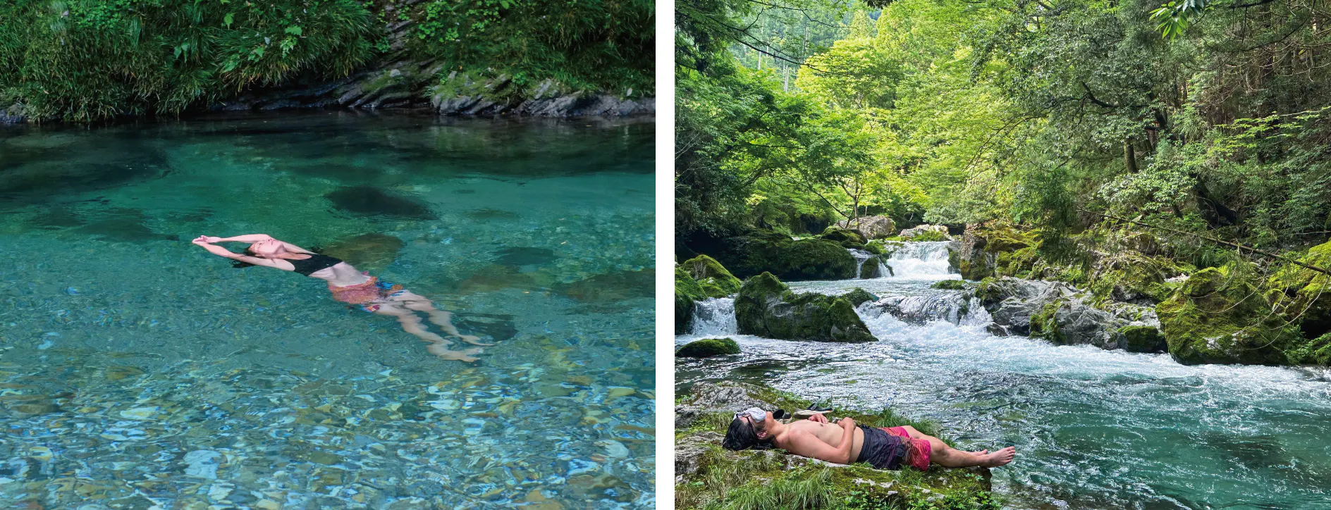 左)伏流水の湧水直下が我らが天然水風呂! 右)水が育む苔むした神秘的な世界