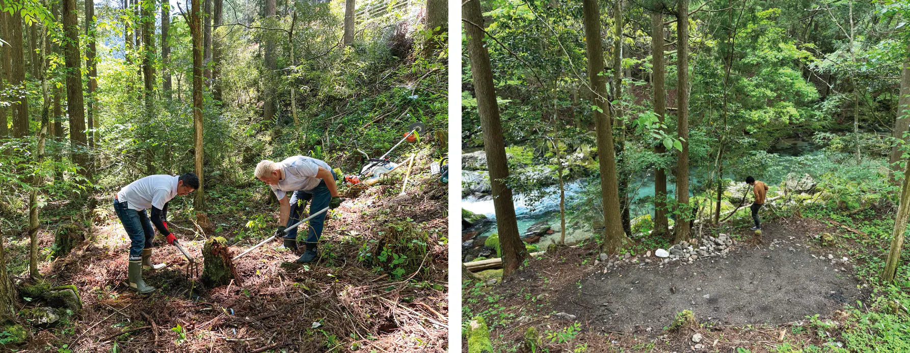 しかし、その“楽園”がある場所にサウナ村を作るのは決して簡単なことではありません。川に至るまでの土地は傾斜した未開拓エリア。そこを一から開拓し、なおかつ自然にインパクトを与えない形で整備する必要があります。最初はその困難さに「無理じゃないか...?」という不安がありましたが、「だからこそやる意味がある!誰も体験したことのないサウナができる!!」と思い直し、挑戦する覚悟を決めました。