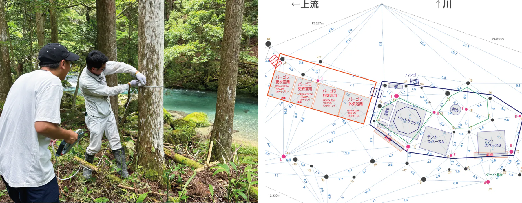 ● プランニング:自然にインパクトを与えない形でプランを構築。建築、河川、消防、公衆浴場法などの各種確認作業も進め、地域や行政への説明を行なっているところです