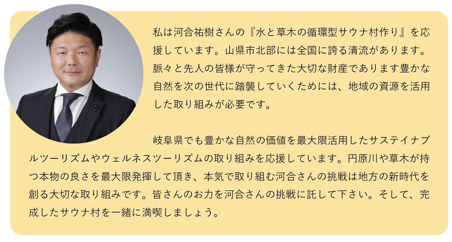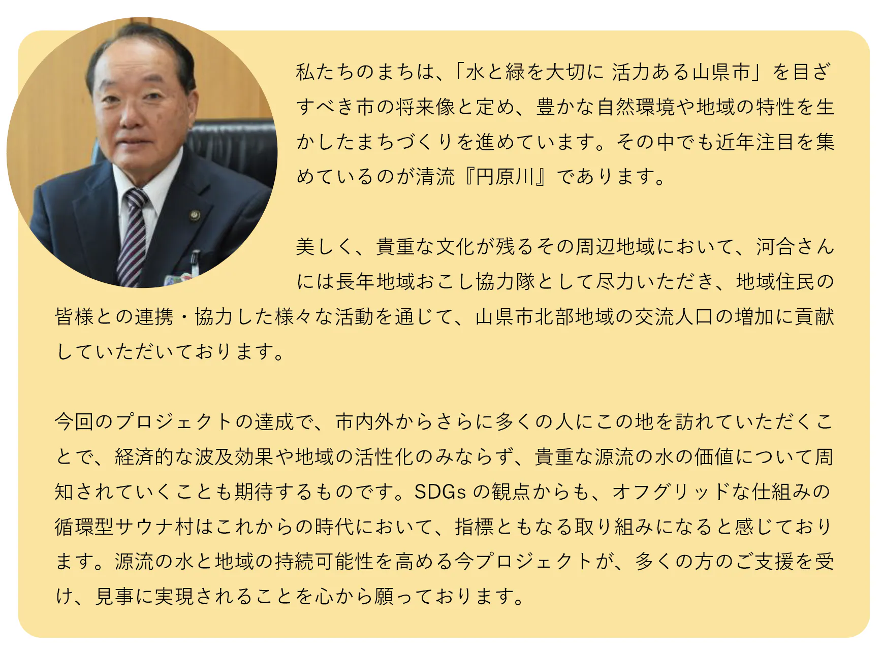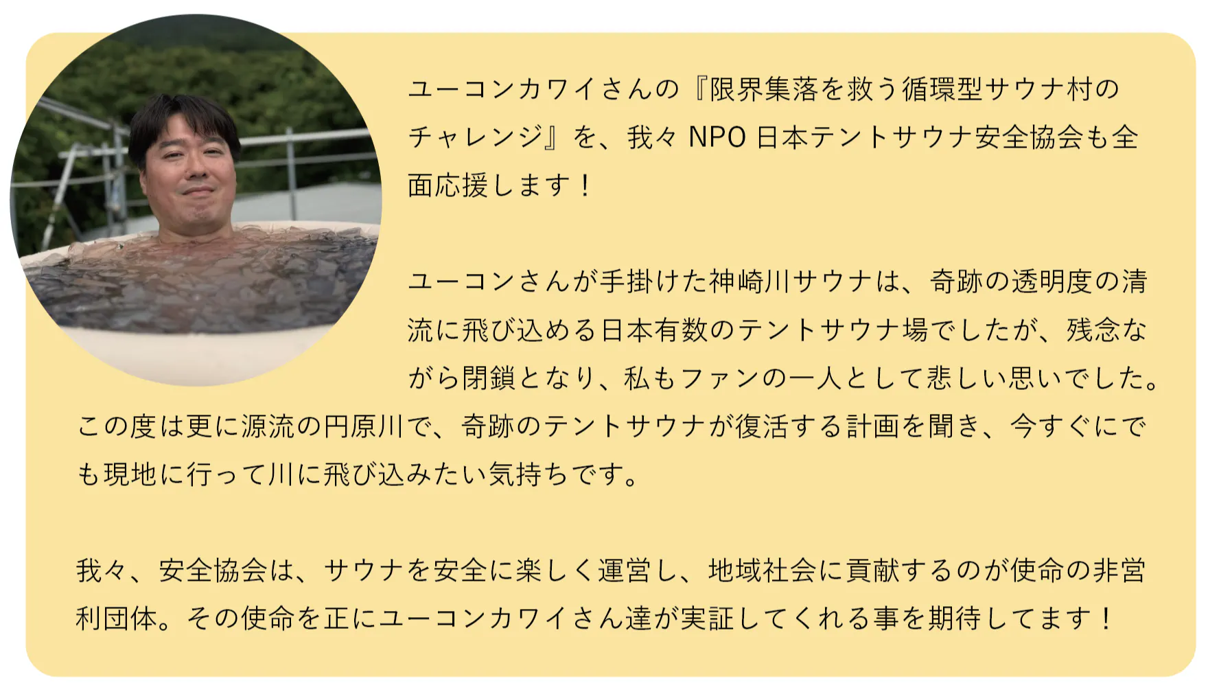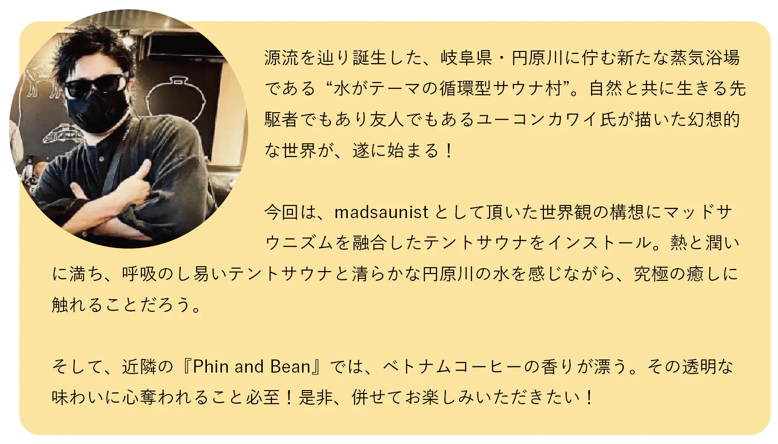 このサウナ村は、円原川の美しさとその水の価値を広めるための入口です。訪れた方々は、サウナを楽しむことで、知らず知らず地域の課題解決や自然保全活動に貢献します。村人(関係人口)となってオフグリッドな村づくりに携わった方々は「豊かに生きるためのヒント」を得ることができるでしょう。
