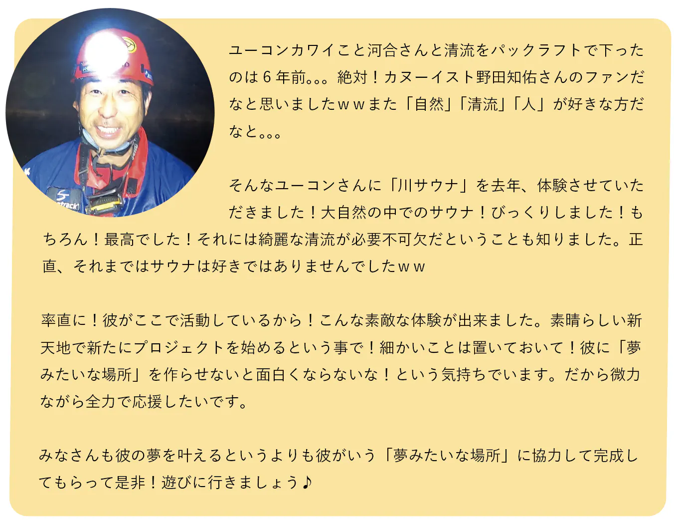 その奇跡のような場所に巡り会えたことで、今ではあの挫折にすら感謝をしています。そして、気持ちも新たに、「この神秘の川に失礼のない最高の場所を作っていこう!」「救ってくれた地域に恩返しをしていこう!!」「サウナーの課題と地域の課題を解決する、素敵な村を作っていこう!!!」と決意を新たにしたのです。