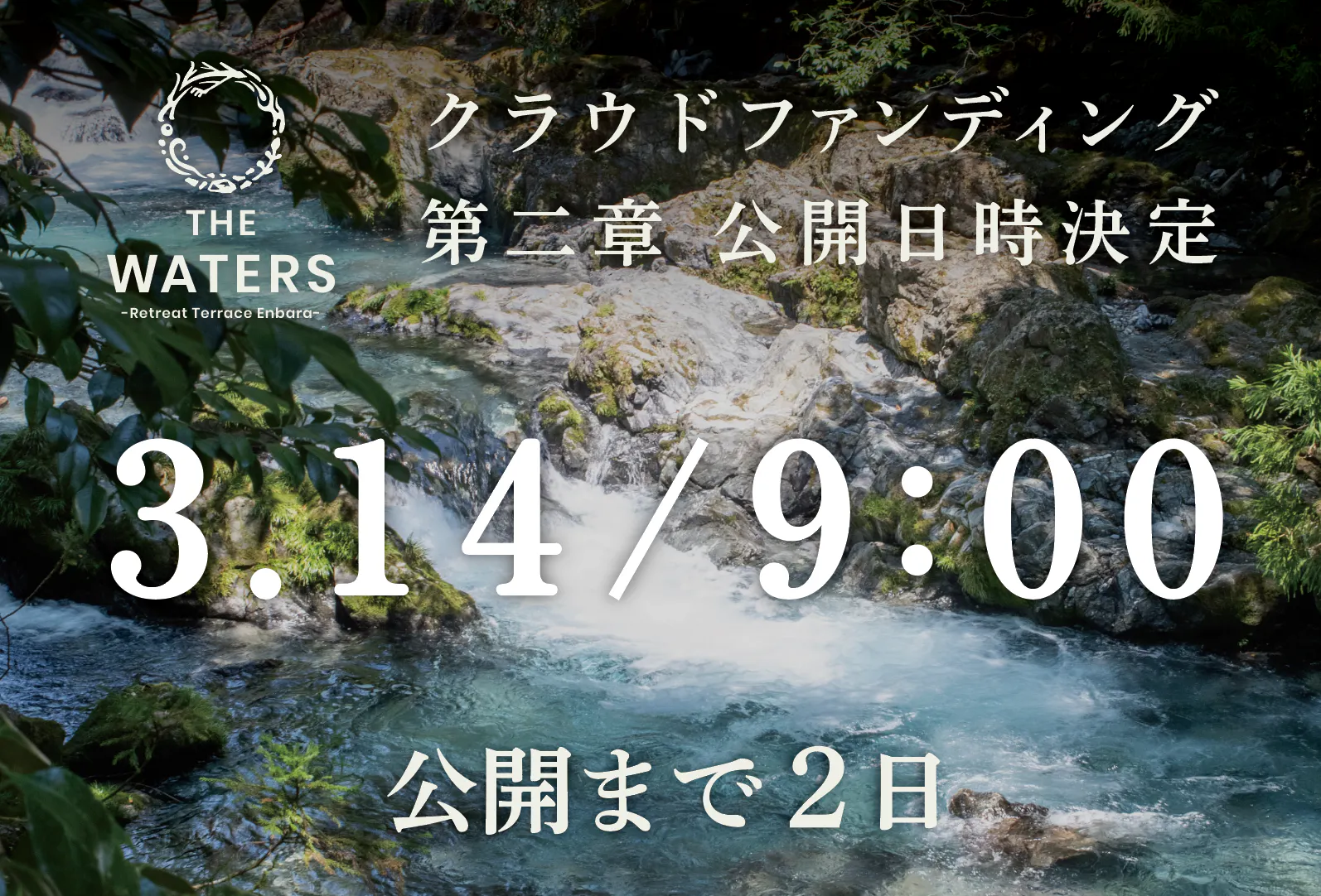 2026/03/12 08:34第一章のクラウドファンディングを応援してくださった皆さまへ。改めて、本当にありがとうございました。皆さんの支援があったからこそ、円原川のほとりにTHE WATERSという場所が生まれました。そしていよいよ──3/14に本オープンを迎えます。ここまで来られたのは、間違いなく第一章の支援者の皆さんのおかげです。本当にありがとうございます。そして第二章が始まります今日は、もう一つ大事なお知らせがあります。THE WATERS 第二章のクラウドファンディングを3/14(土)9:00からスタートします。実はこれは狙ったわけではないのですが、第一章の終点(本オープン)と第二章の始点(クラウドファンディング公開)が同じ日になりました。3/14、円周率 3.14。THE WATERSのロゴにもある「円」は水の循環自然の循環そして人の循環そんな意味を込めています。第一章の終わりが、そのまま第二章の始まりになる。そんな流れになったことを少し不思議で、でも嬉しく感じています。第二章で挑戦すること第一章では清流のほとりにリトリートサウナテラスをつくるところまで来ることができました。でも、THE WATERSの構想はまだ完成ではありません。今回の第二章では「第二テラスの整備」に挑戦します。※画像はイメージこれは売上を増やすための拡張ではありません。自然の中で心身を回復する時間。その体験の密度を高めるための整備です。THE WATERSが目指しているのは進化ではなく“深化”。少しずつ、でも確実にこの場所を育てていきたいと思っています。これから訪れるTHE WATERSの未来THE WATERSは単なるサウナ施設ではありません。街で忙しく暮らす人がふっと呼吸を整えに来る場所。自然の中で心と体を取り戻す場所。そしてまた帰ってきたくなる場所。そんな存在になっていけたらと思っています。まだまだ未完成ですが、これからも少しずつこの場所を育てていきます。皆さまにお願いがありますクラウドファンディングは公開直後のスタートダッシュがとても重要です。現在、公開前ページを見ることができる状態になっています。もしよろしければページの「お気に入り」ボタンを押していただき、公開通知を受け取れるようにしていただけると嬉しいです。プロジェクト公開前の確認ページはこちら↓https://camp-fire.jp/projects/932919/preview?token=2575qyax&utm_campaign=cp_po_share_c_msg_projects_show3月14日(土) 9:00第一章の終点であり、第二章の始まりでもある日。もしよろしければ、第二章も一緒に見守っていただけたら嬉しいです。THE WATERSは僕一人が作った場所ではありません。第一章で支援してくださった皆さんが一緒につくってくれた場所です。だからこそこの場所がこれからどう育っていくのかもぜひ一緒に見届けてもらえたら嬉しいです。3/14、第一章の終点であり第二章の始まりの日。もし可能であればまた力を貸してください。そして、この場所を必要としてくれそうな人にぜひシェアしてもらえると嬉しいです。これからもTHE WATERSをよろしくお願いします。 もっと見る