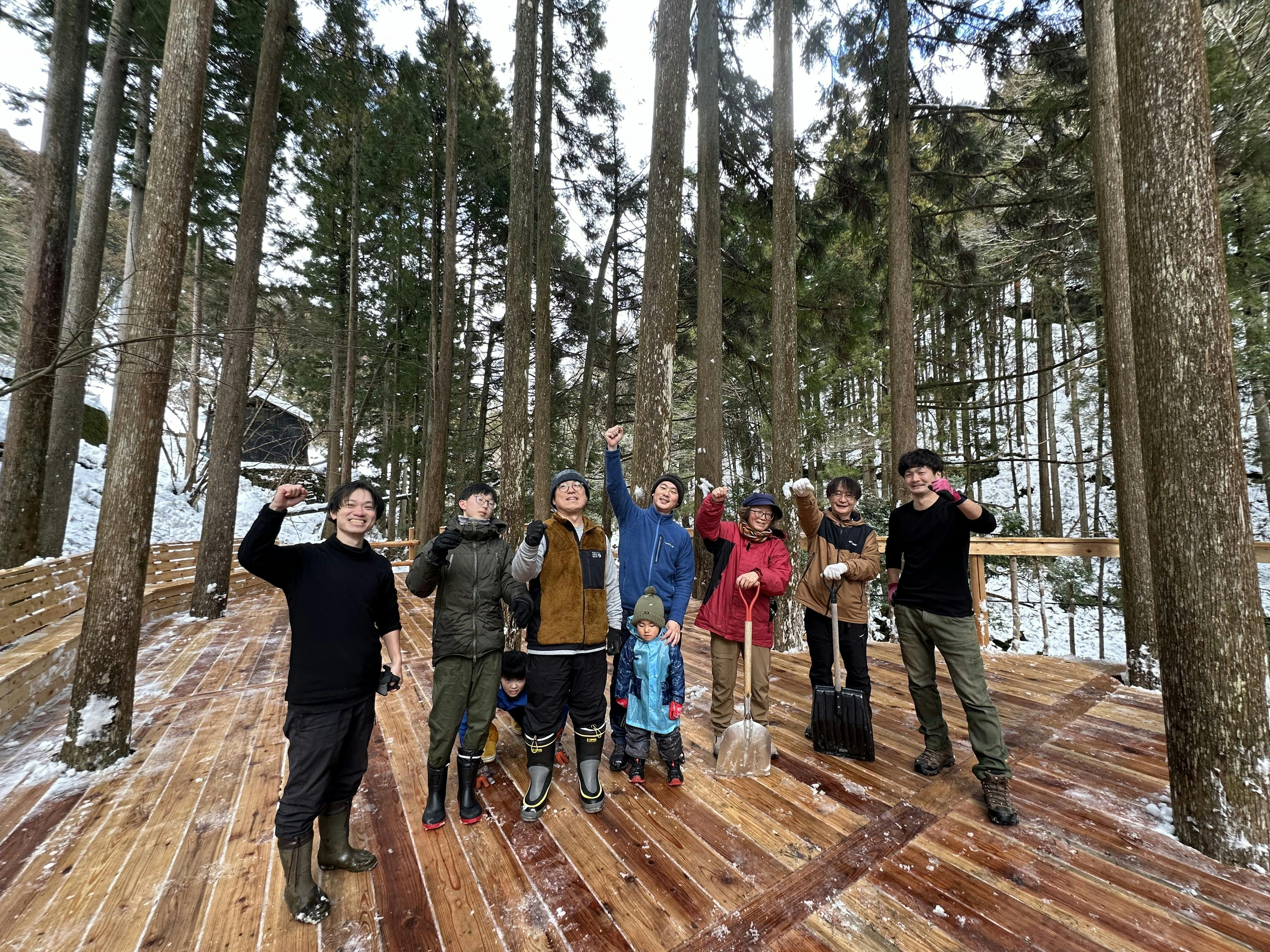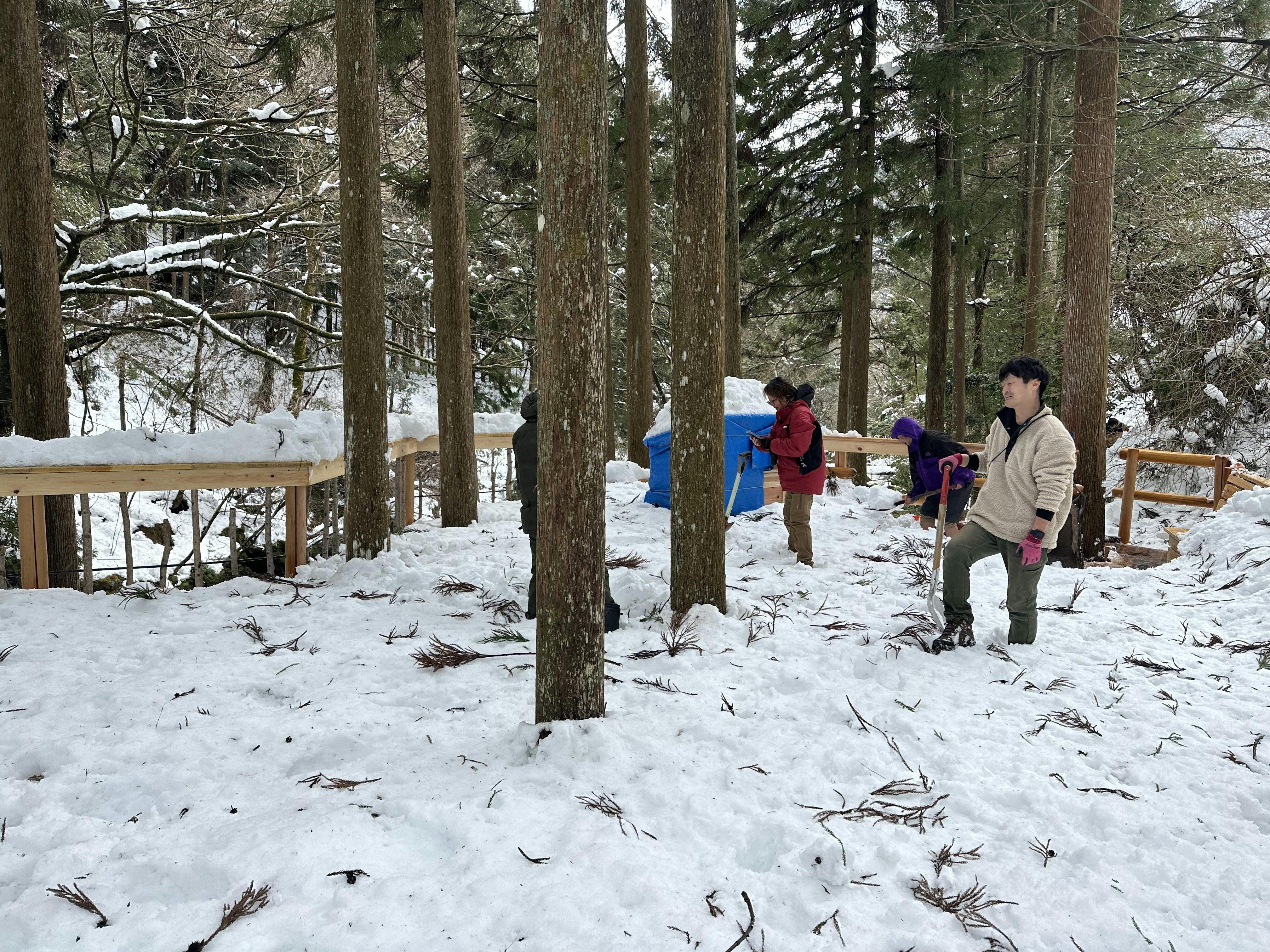 現在建設中のツリーテラスも雪の重みで傾いてしまい、修復・補強作業を余儀なくされました。
