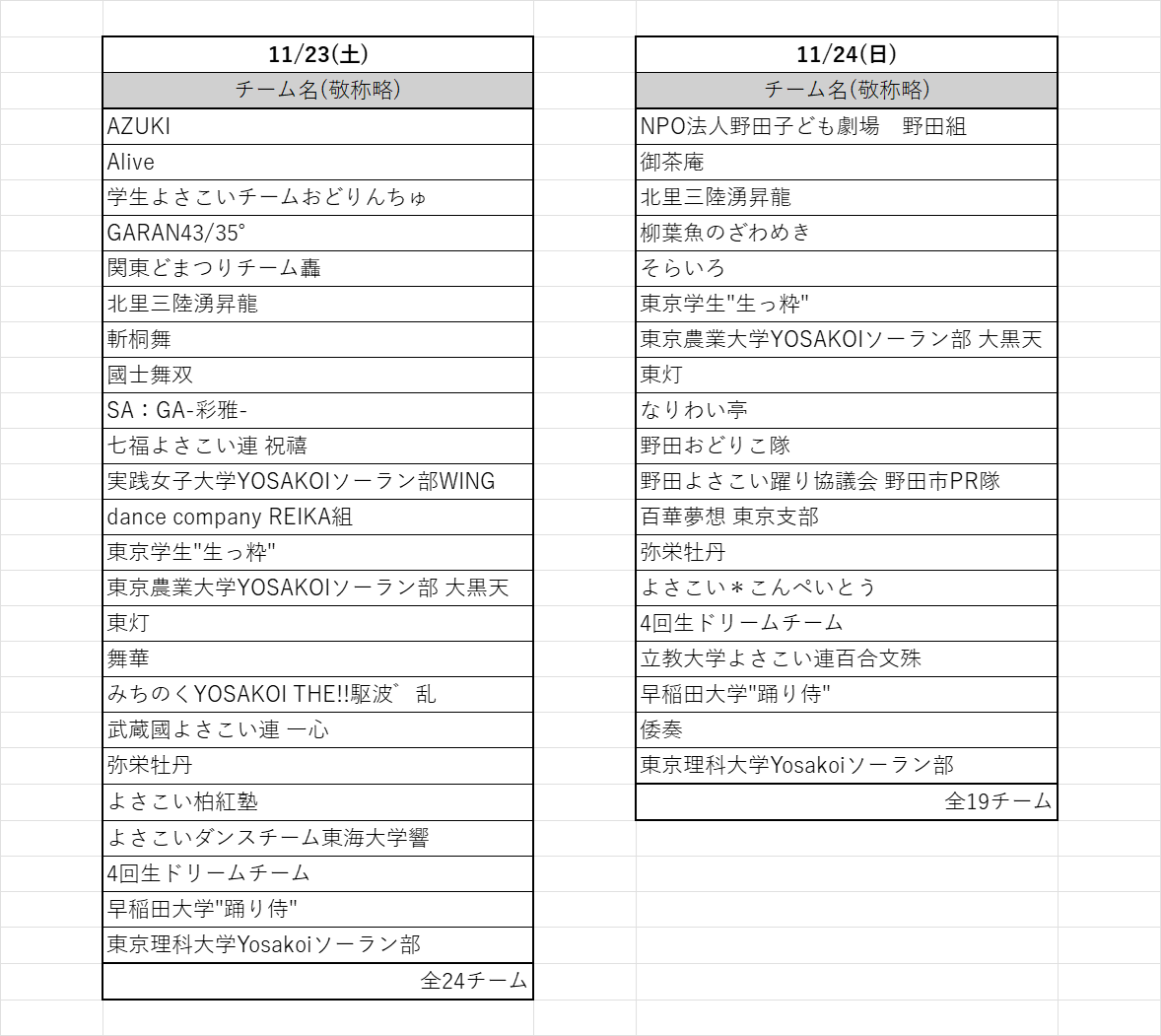 この度2024年11月23日、24日に "理大祭よさこい2024" を開催する運びとなりました。他大学や社会人のチームにお声がけさせていただき、総勢35チーム約800名の踊り子が参加いたします。