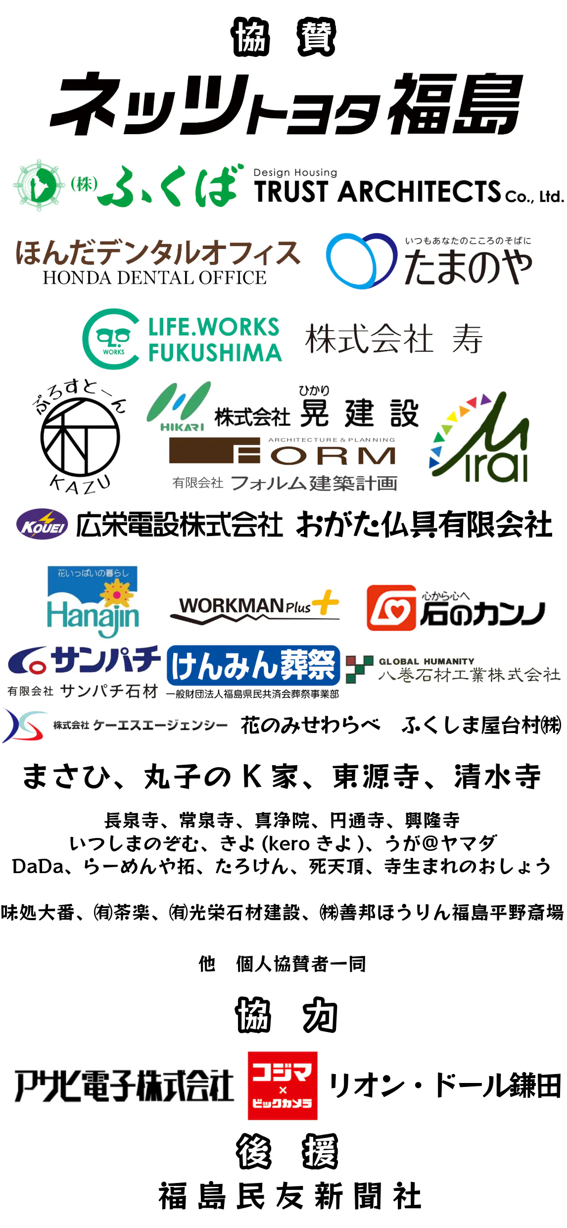 ぷろすとーん和・仏壇のふくば・広栄電設・光栄石材建設・JAふくしま未来・おがた仏具店・ネッツトヨタ福島・花甚・ワークマンプラス鎌田店・晃建設・味処大番・トラストアーキテクツ・茶楽・フォルム建築計画・善邦ほうりん平野斎場・八巻石材工業・サンパチ石材・石のカンノ・KSエージェンシー・けんみん葬祭・たまのや