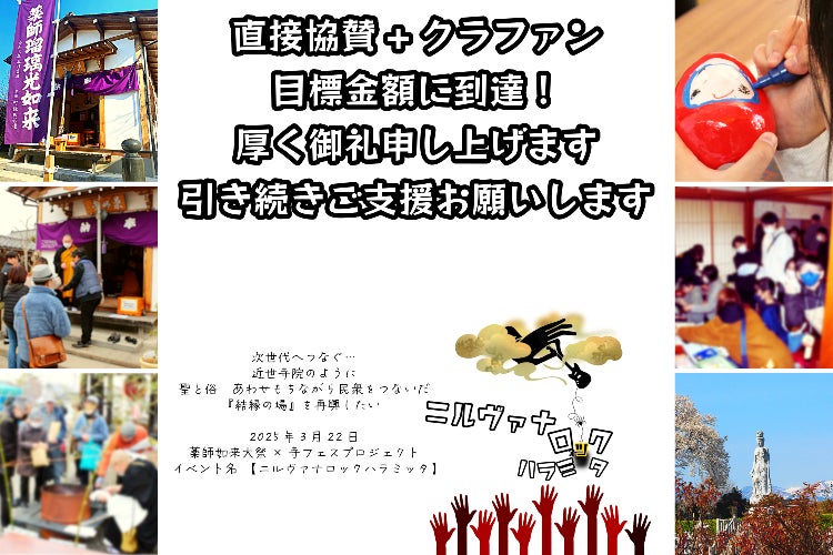 2025/02/14 14:46今現在75万円の協賛をいただいております。誠にありがたく存じます。返礼品の準備中です。今しばらくお待ちください。※当日来山のファンディング申込者様へTシャツやチケットなどは事前に郵送いたしますが、お守りは祈祷がございますので郵送せず薬師堂にてお渡しいたします。来山されない方にはイベント終了後郵送いたします。ご了承ください。鎌秀院拝 もっと見る