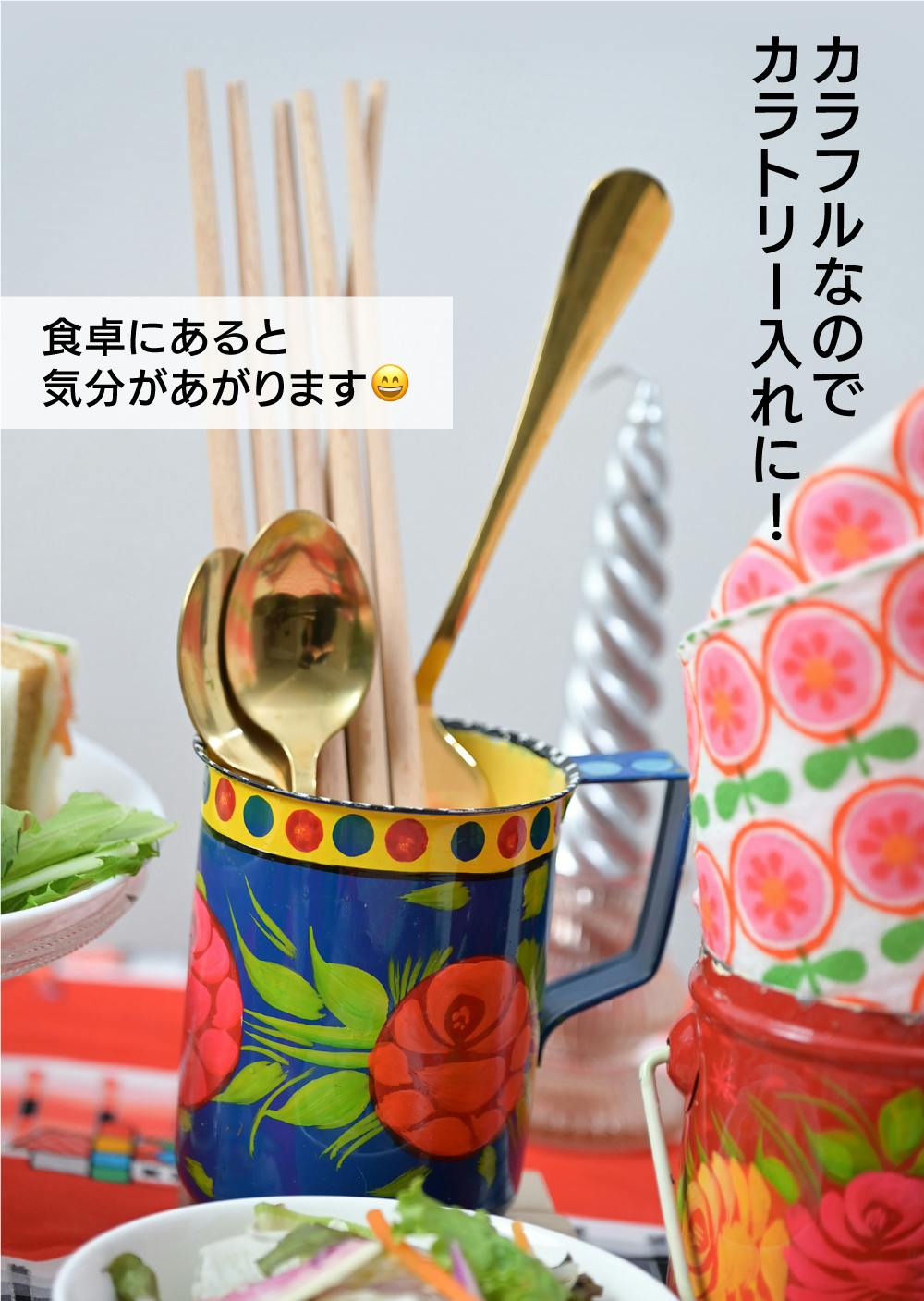 金属製の食器類にひとつずつ手描きで色を描いた昔懐かしい雰囲気の雑貨です。