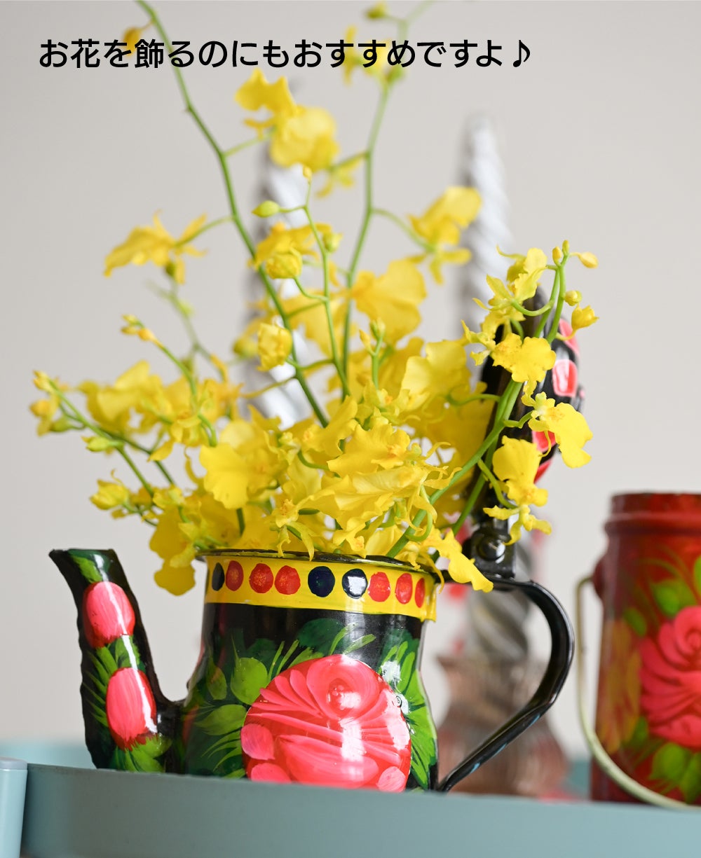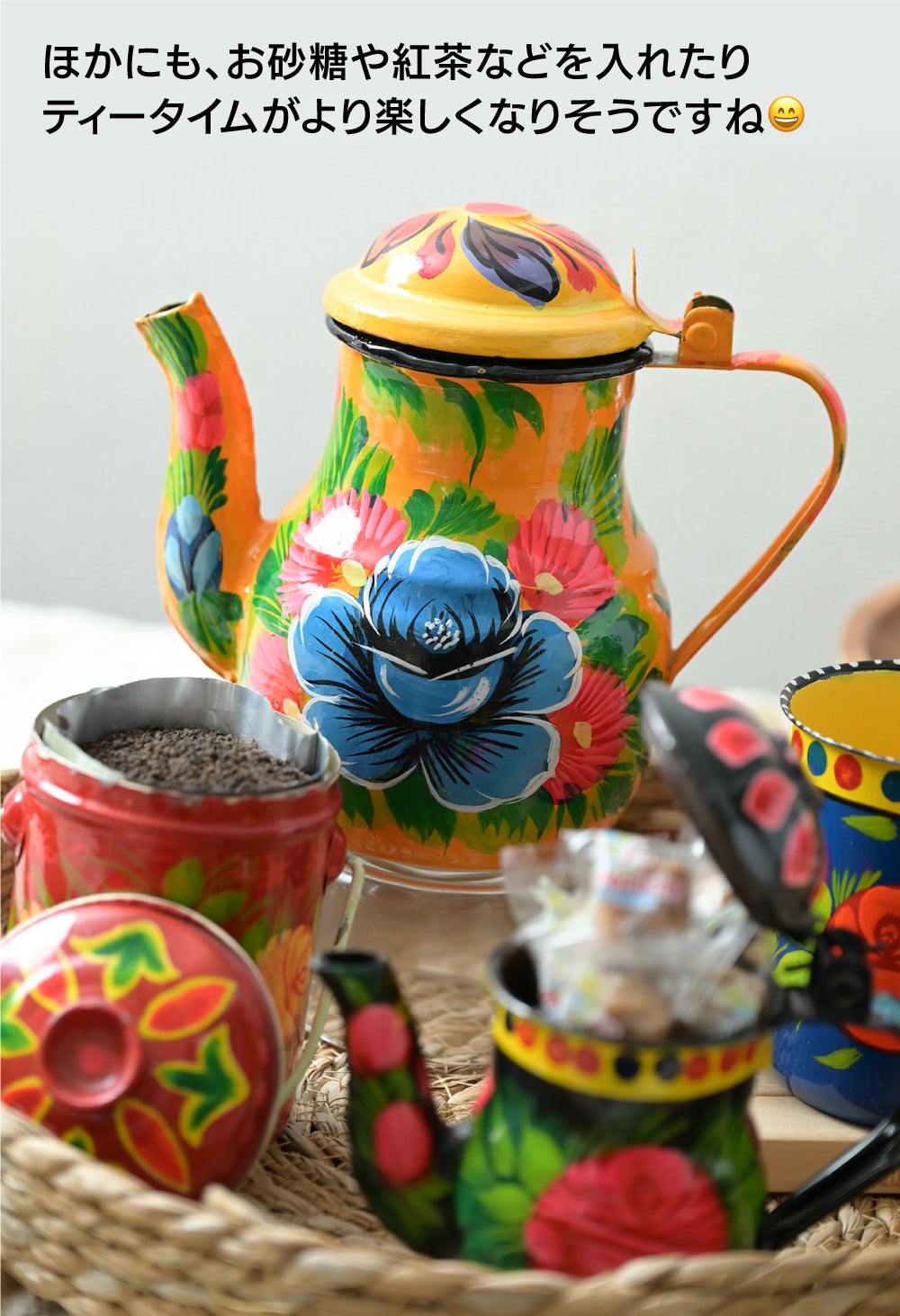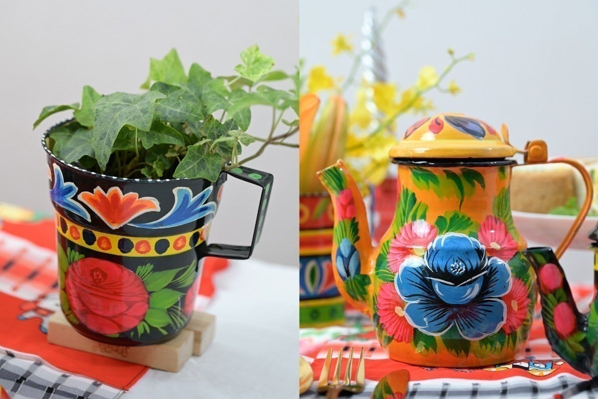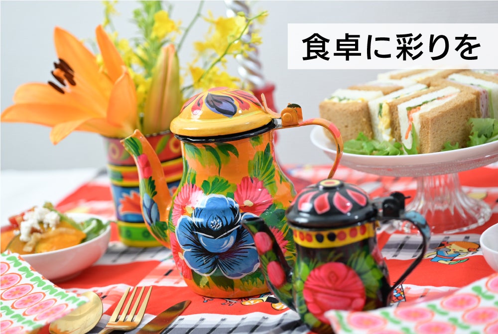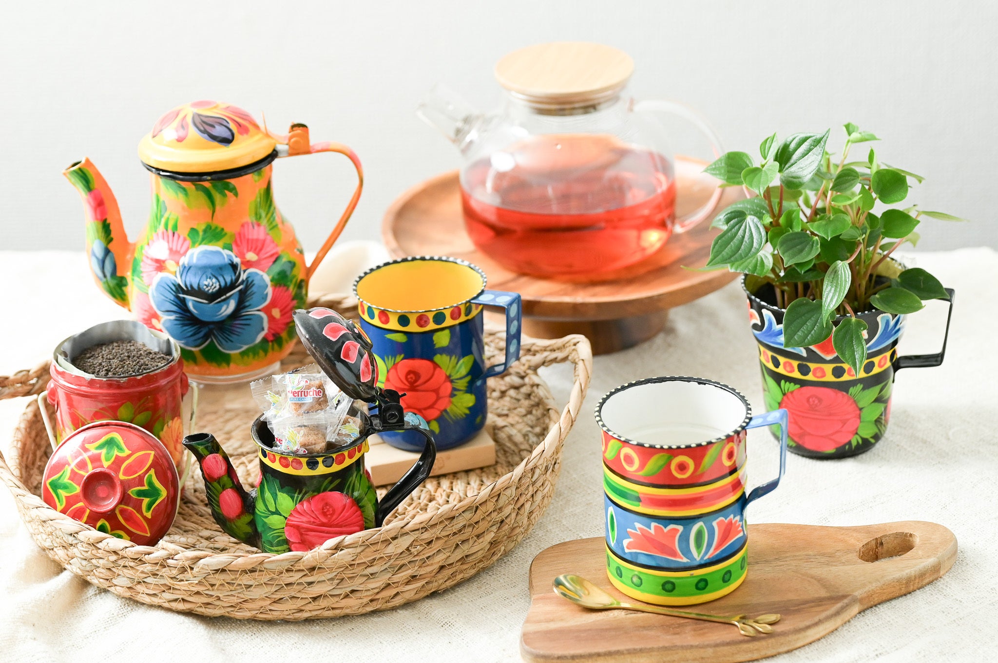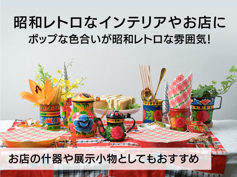金属製の食器類にひとつずつ手描きで色を描いた昔懐かしい雰囲気の雑貨です。