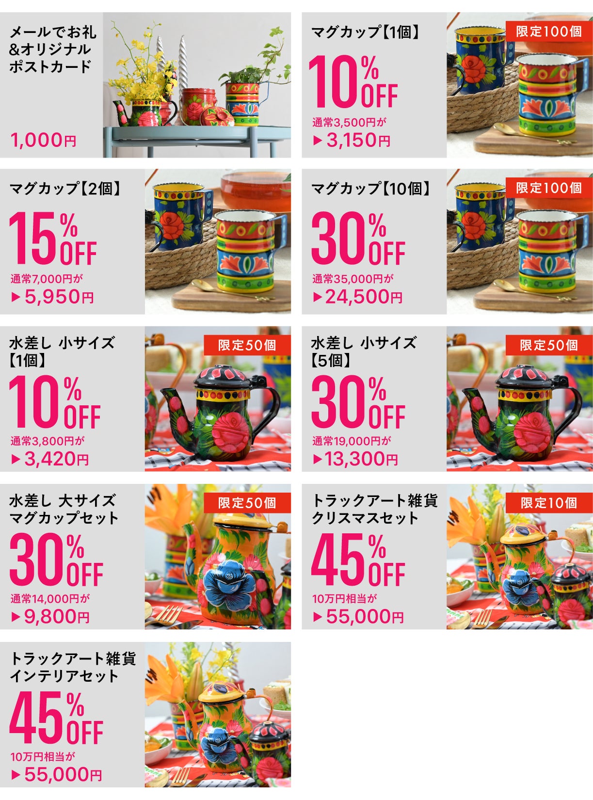 2024/12/10 08:31この度は、トラックアートの応援ありがとうございました。リアルでのお渡しは12月1日に終了いたしました。ありがとうございました。引き続き配送でのお渡しを進めてまいります。なお、水差しをご注文頂いた方の住所がわからずです(;´∀`)恐れ入りますがご住所を個別にメールで教えていただけると助かります!!現在こちらを食器用として、検査機関に送る準備中です!意外と色々手続きが煩雑なのですが、、キャンプで使いたいのお声もありますので来年に向けて色々整えていきたいと思ってます!!引き続きよろしくお願いします。 もっと見る