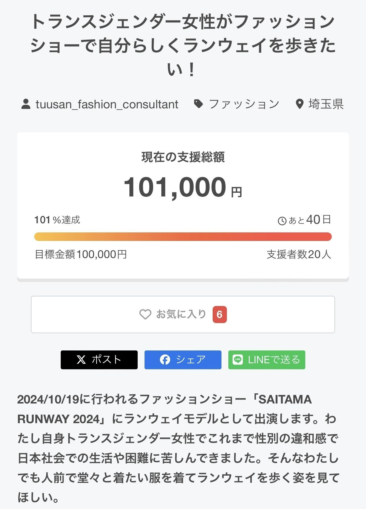 人生で始めてのファッションショーに出演をし、楽しむと同時に性別にとらわれることなく自分を表現する姿を見ていただきたい。そしてLGBTQ+の人たちを知ってもらうキッカケになって欲しいです。ぜひ一緒にSAITAMA RUNWAY 2024の出演を応援していただきたいです!